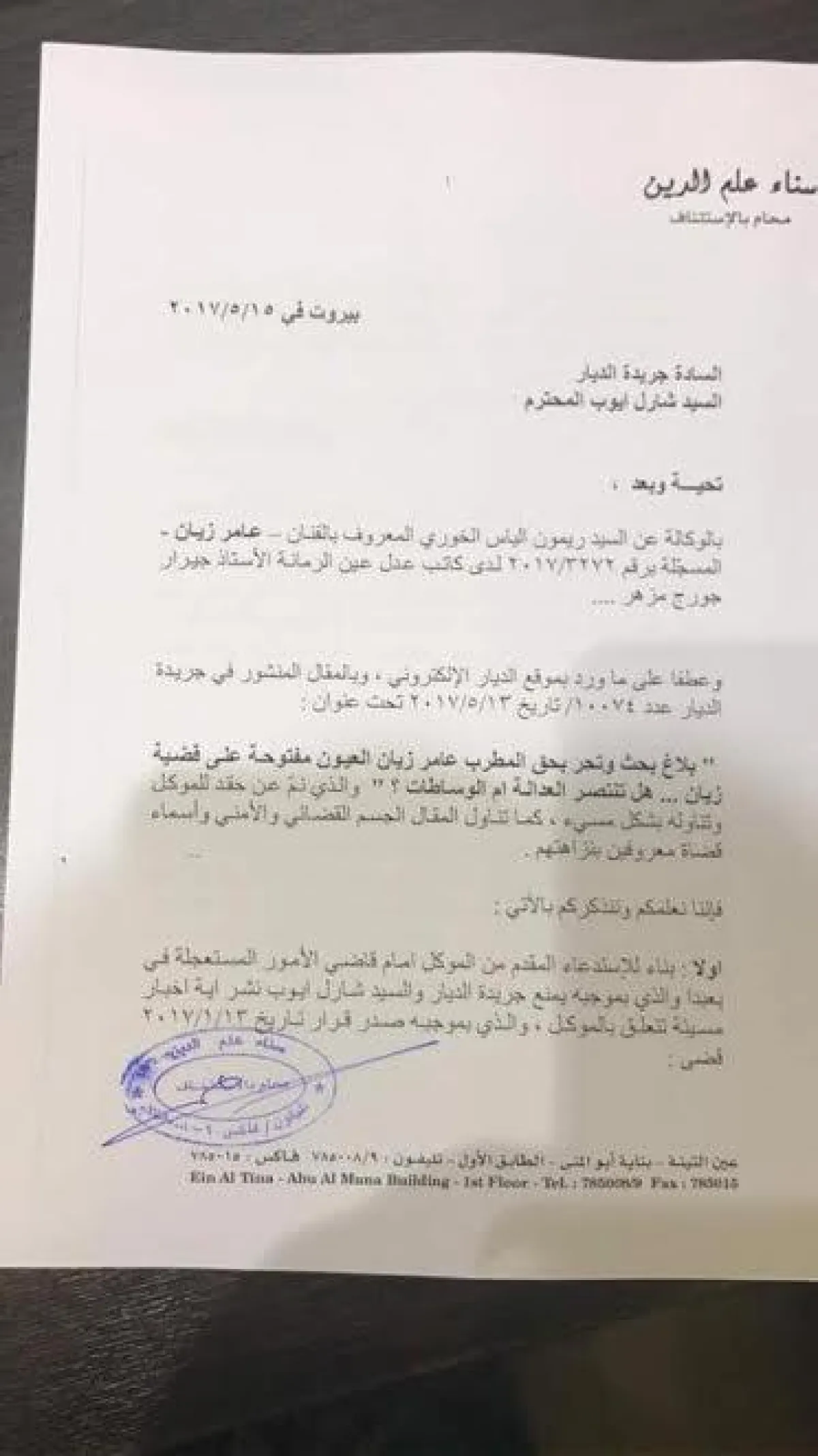 من ناحية أخرى تقدّم عامر زيّان بدعوى قضائيّة بحق الديار، على خلفيّة نشرها خبرًا غير صحيح بحقّه، وجد فيه تدخلًا في أمور شخصيّة، على خلفيّة نشرها حادثة تتعلق بشرائه شقّة من سيدة تعمل في أحد المصارف، رفعت دعوى ضدّه، مع أنّه يملك عقد بيع وبراءة ذمّة.