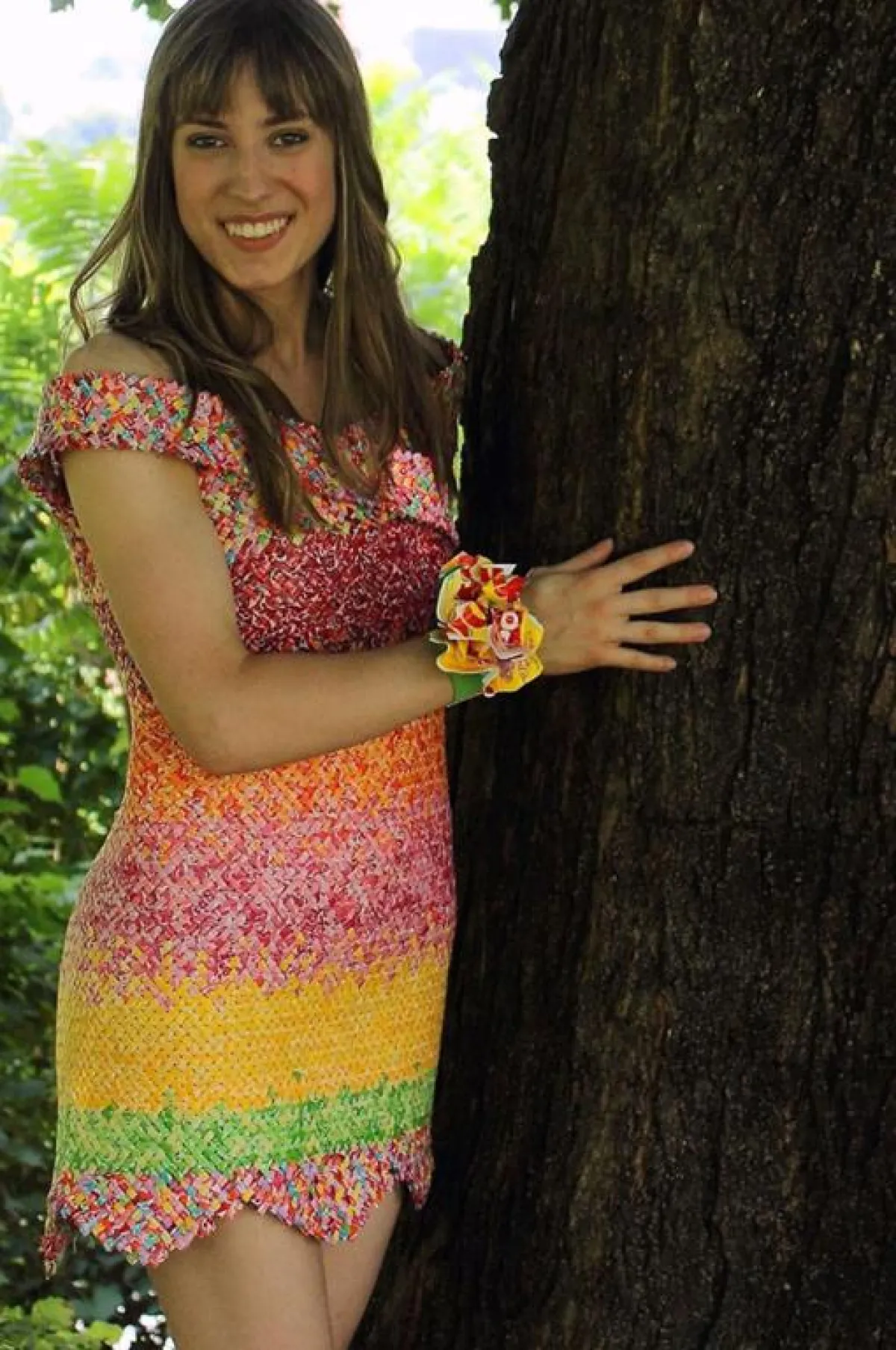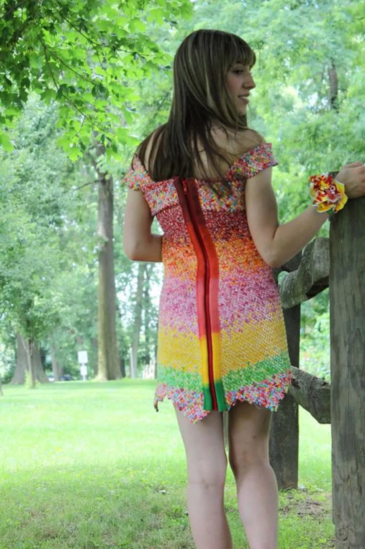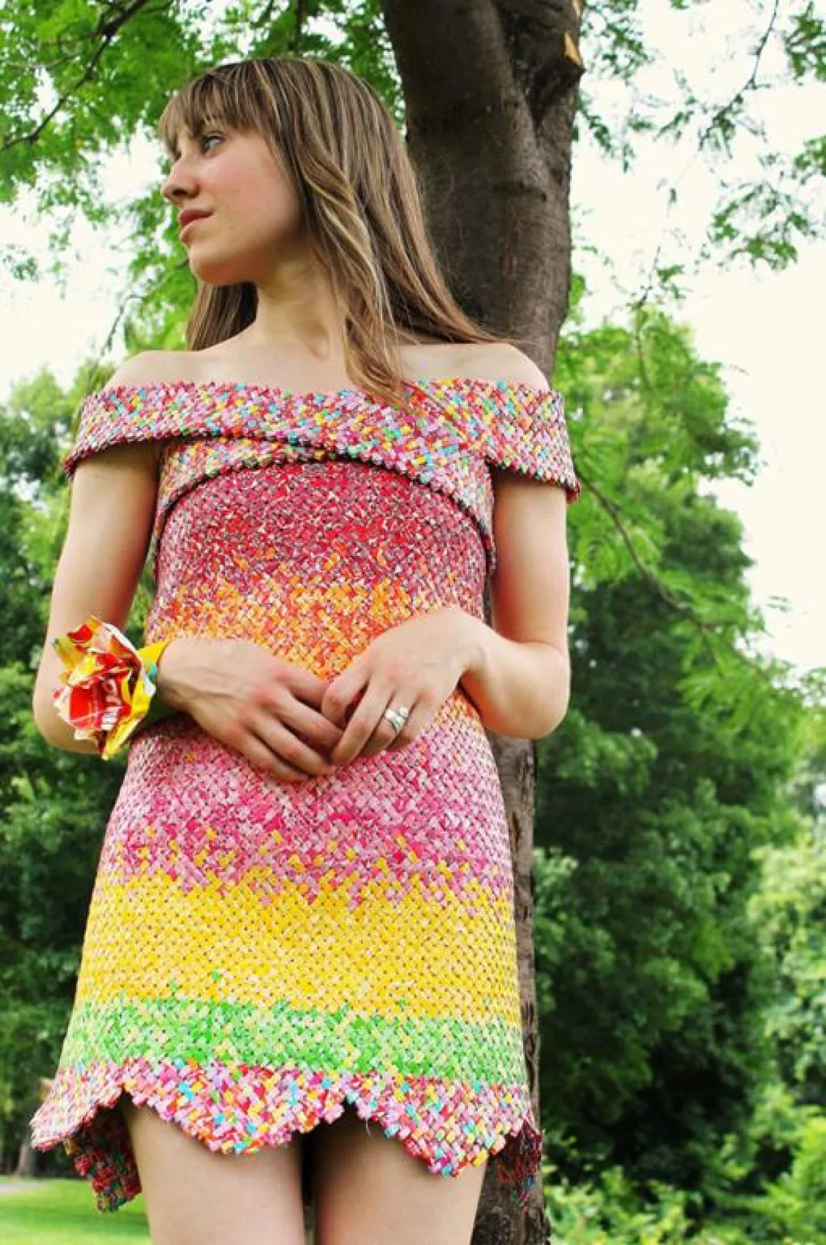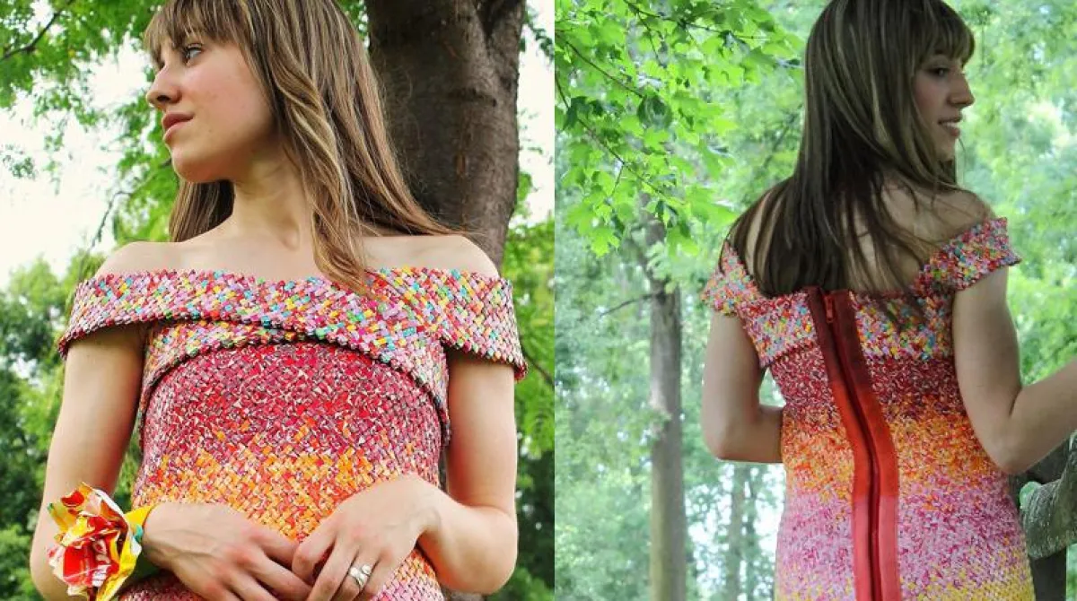 قررت شابَّة أن تعبِّر عن مدى حبِّها لزوجها ومشاركته حلواه المفضلة، فقامت بتصميم فستان مميَّز لا مثيل له من أغلفة حلوى زوجها المحببة إليه، وهي حلوى "التُّوفي".