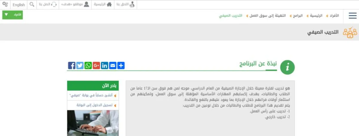 ويسمَّى البرنامج، الذي يصدر عن "هدف" للطلاب والطالبات، بالبرنامج الصيفي، ويقوم بتدريبهم لفترة معينة خلال الإجازة الصيفية، وهو موجَّه إلى مَن هم فوق سن 17 عاماً من الطلاب والطالبات، ويهدف إلى إكسابهم المهارات الأساسية المؤهلة لسوق العمل، وتمكينهم من استثمار أوقات فراغهم خلال الإجازة بما يعود عليهم بالنفع والفائدة.