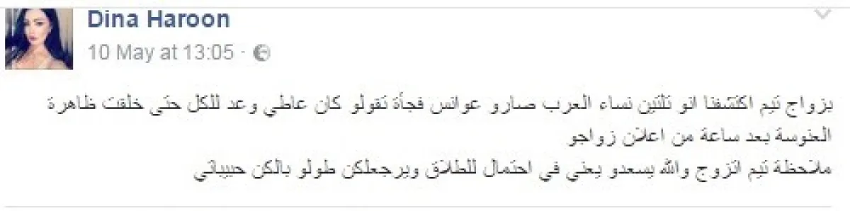أثار التعليق الذي نشرته الفنانة السوريّة دينا هارون، عقب زواج الفنان تيم حسن والإعلاميّة وفاء الكيلاني، الكثير من ردود الأفعال، وشنّت صفحات المعجبين بالنجمين هجومًا كبيرًا على "دينا" ربّما يكون هو الأقوى، حيث قالت دينا في تعليق نشرته عقب إعلان خبر عقد قران تيم ووفاء : " بزواج تيم اكتشفنا انو تلتين نساء العرب صاروا عوانس، فجأة تقولو كان عاطي وعد للكل، حتى خلقت ظاهرة العنوسة بعد ساعة من إعلان زواجو".