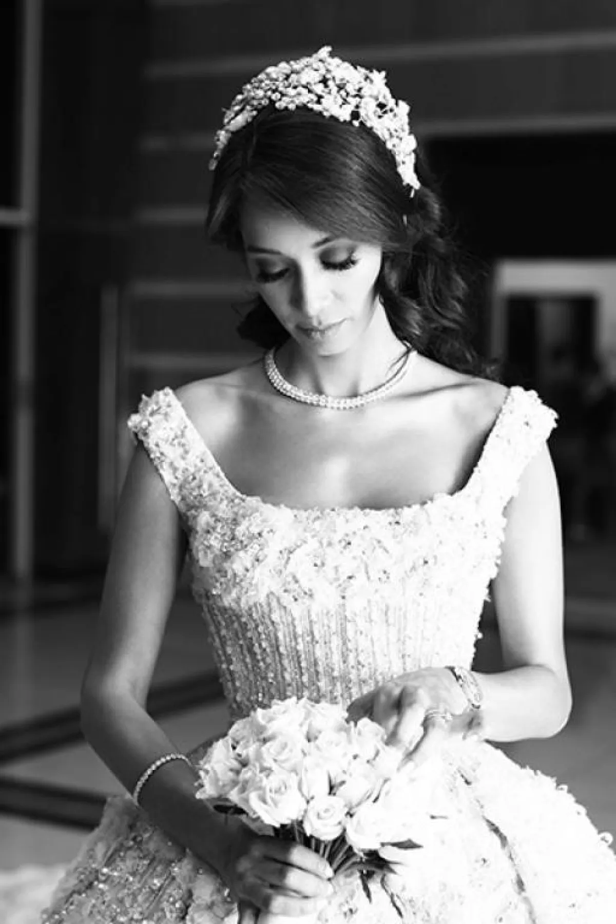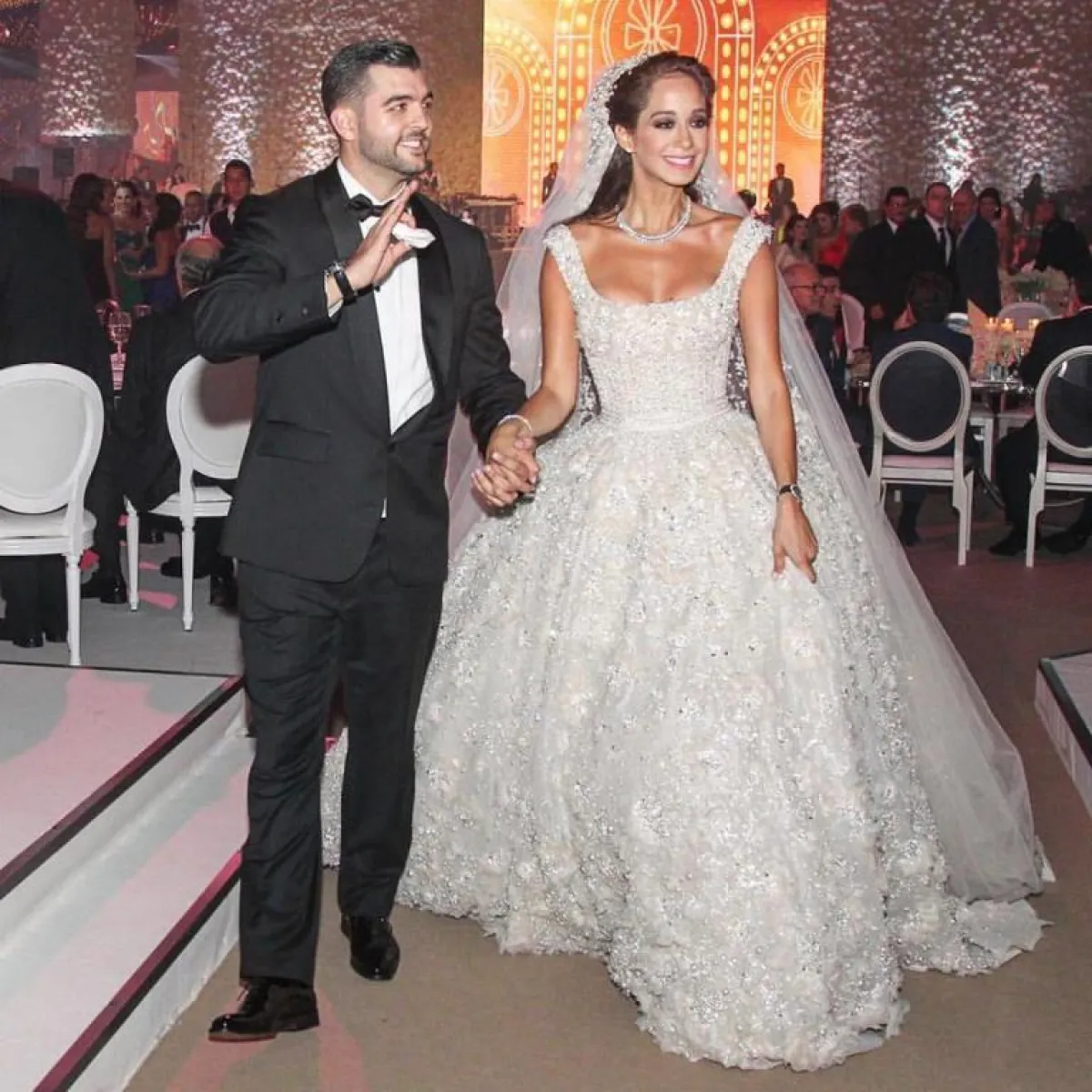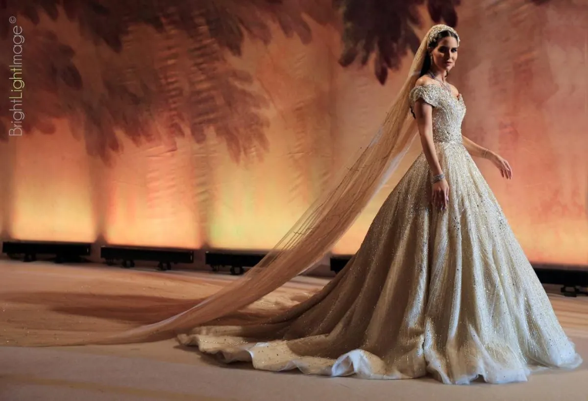 ارتدت العروس فستان زفاف من توقيع اللبناني ايلي صعب، أما تسريحة العروس بأنامل مصفف الشعر طوني مندلق والمكياج من فادي قطايا.