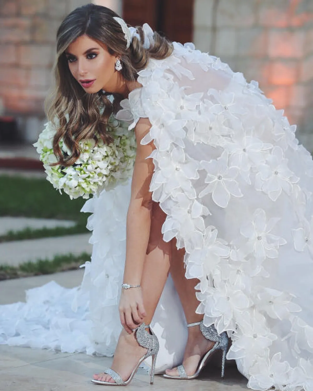 ارتدت بلخي فستان زفاف أنيق التصميم، وزيّنته بطرحة مميزة، زيّنت بنقوش الورود البيضاء.