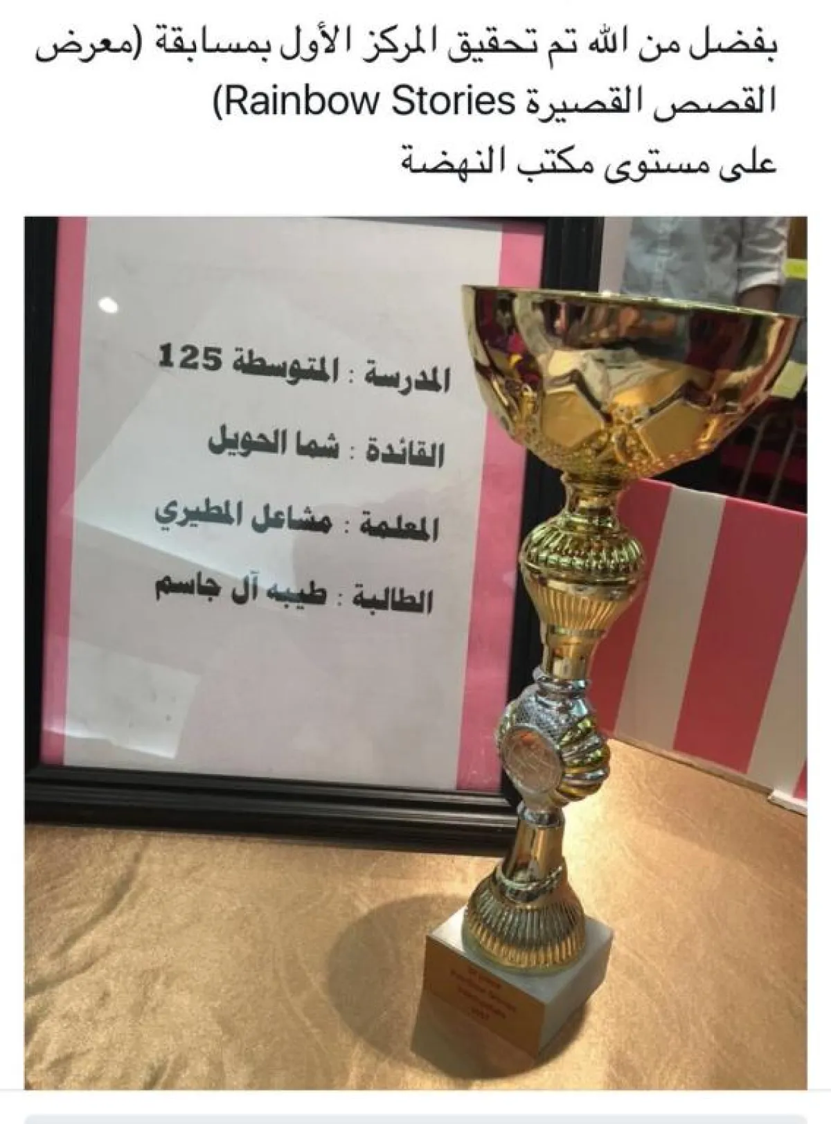 وأضافت المعلِّمة آمنة: لا أجد ما أقوله سوى أنَّ طيبة طالبة رائعة بكل المقاييس، أنا أحبُّها لدرجة أنني أسألها يوميَّاً عن اختبارها دون باقي الطَّالبات.