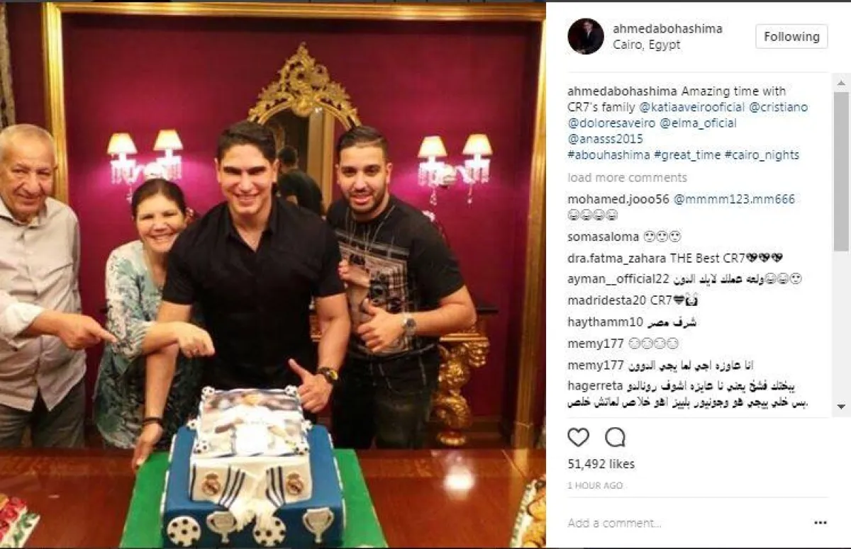 في إطار زيارة عائلة نجم كرة القدم البرتغالي كريستيانو رونالدو Cristiano Ronaldo إلى مصر، اجتمع رجل الأعمال الشهير أحمد أبو هشيمة، زوج النجمة هيفاء وهبي السابق، على مائدة الفطور مع العائلة أثناء رحلتهم في شرم الشيخ.
