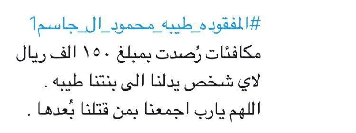 وقد أطلقت عائلة الطالبة هاشتاقاً جديداً بعنوان "#المفقوده_طيبه_محمود_ال_جاسم 1" بعد الهاشتاق الأول "#المفقوده_طيبه_محمود_ال_جاسم"، الذي تم حجبه لأنه وصل إلى "الترند الأعلى". وتم في الهاشتاق الجديد الإعلان عن مكافأة مالية من قِبل العائلة وقدرها 150 ألف ريال لمَن يملك معلومات تدل على مكان طيبة، وطالبت العائلة بعدم تداول المعلومات الكاذبة، التي انتشرت في حسابات عدة على "تويتر".