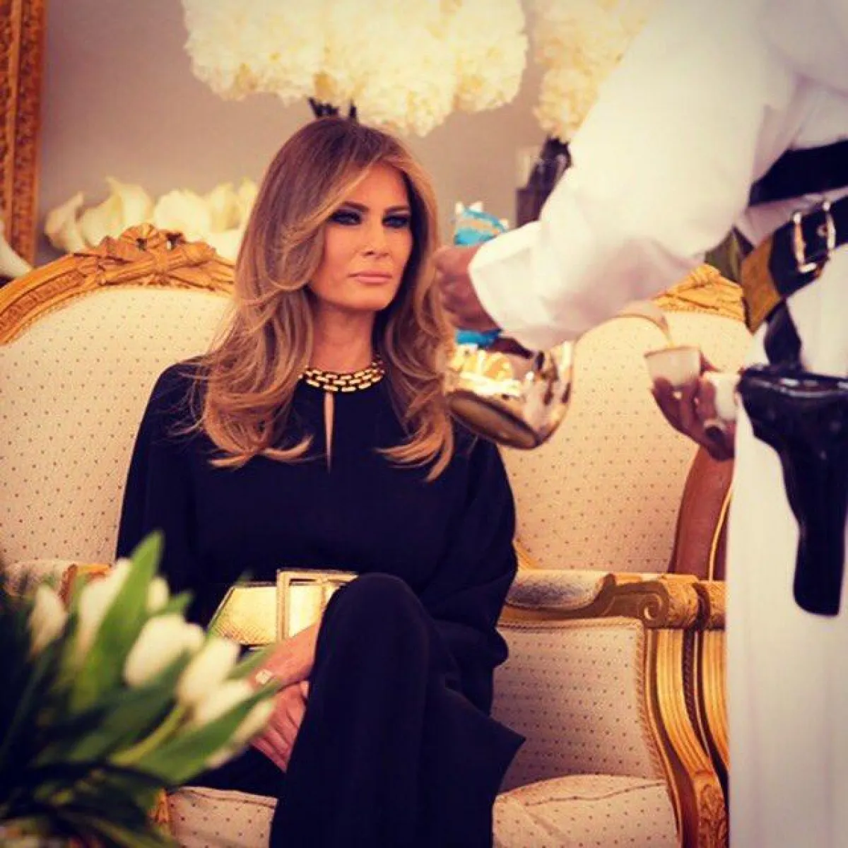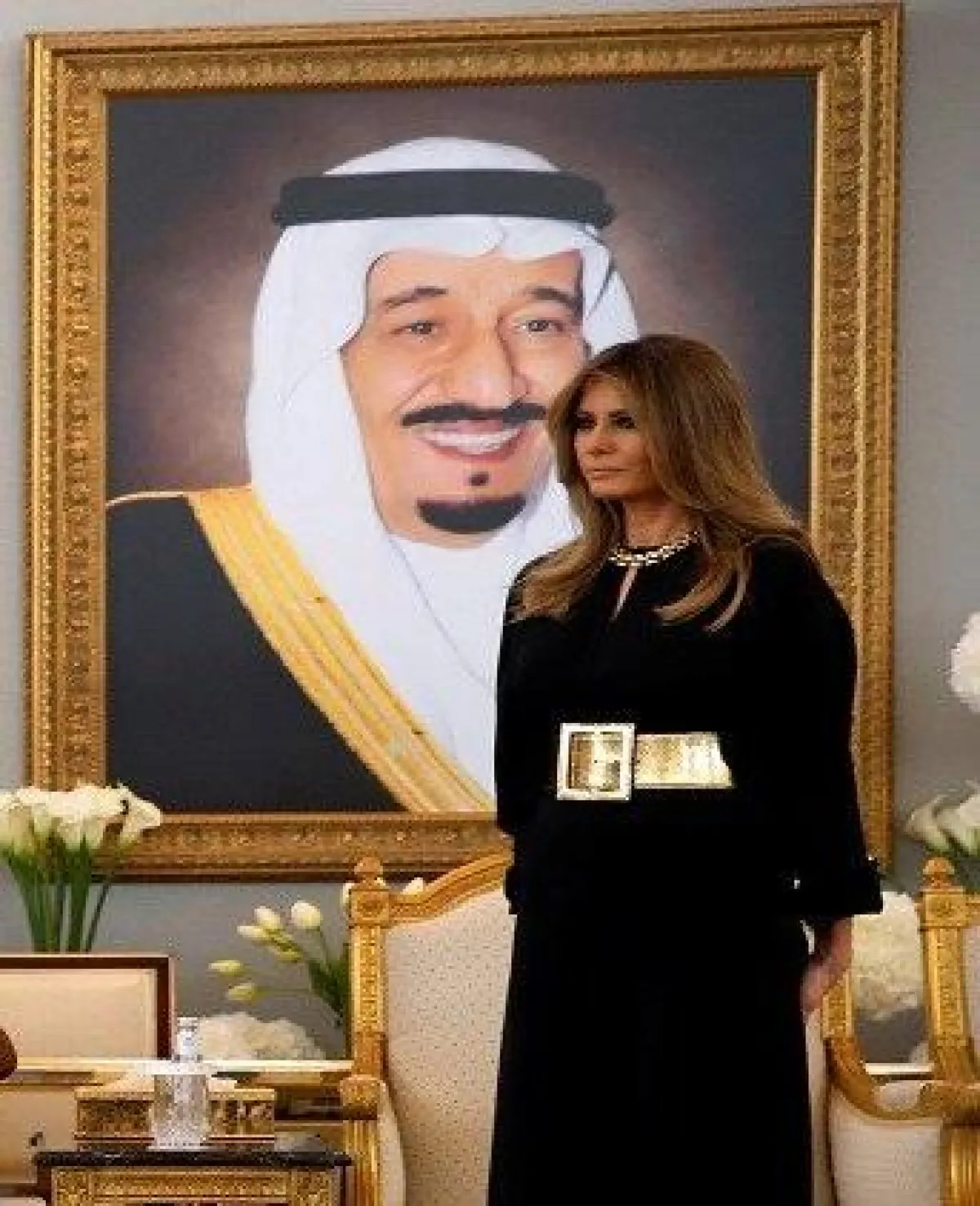 إلا أنّ أكثر ما شغل روّاد مواقع التواصل الاجتماعي هو صعود ميلانيا إلى الطائرة من البيت الأبيض مرتديةً تنورة قصيرة وبلوزة بيضاء ونزولها منها إلى الأراضي السعودية وهي ترتدي بنطالاً وسترة سوداوين وحزاماً ذهبياً يشبه بتصميمه العباية الخليجية ما يراعي العادات والتقاليد في السعودية بعدما قررت عدم تغطية شعر رأسها.