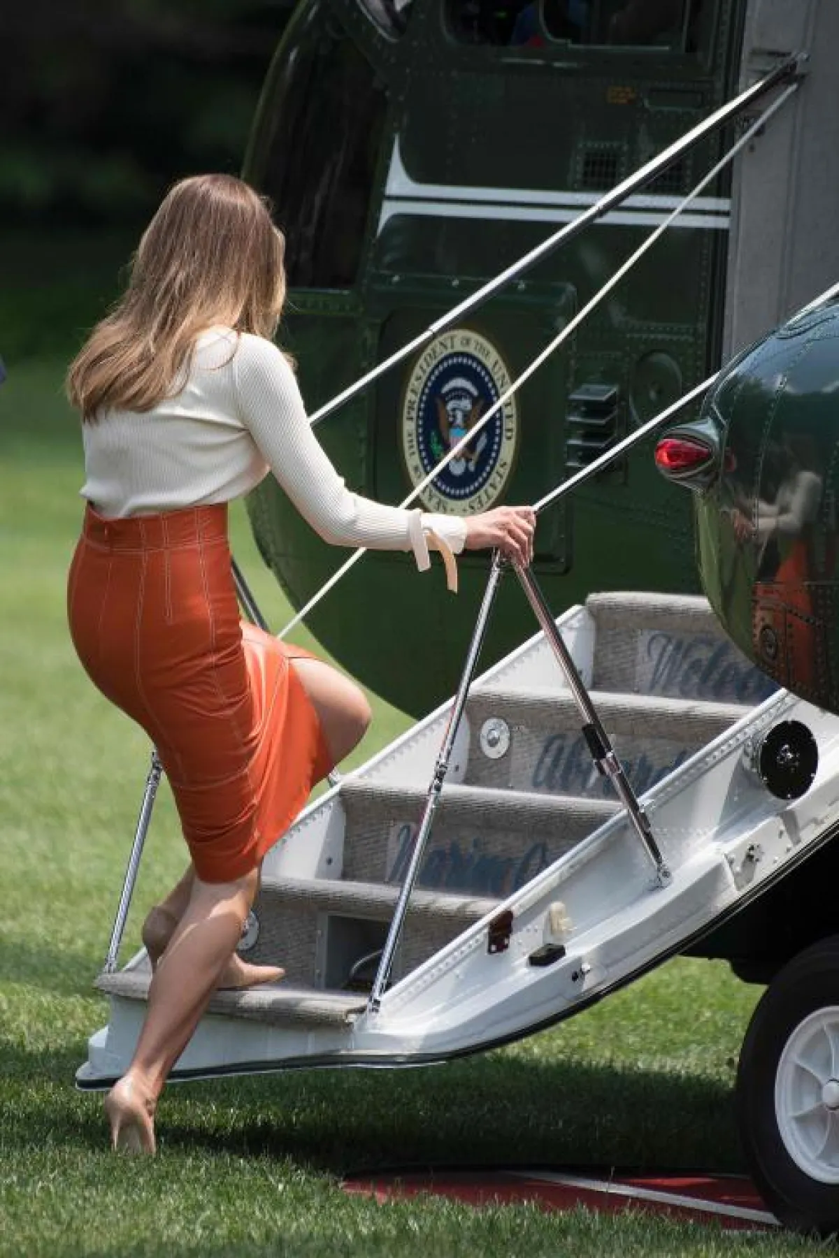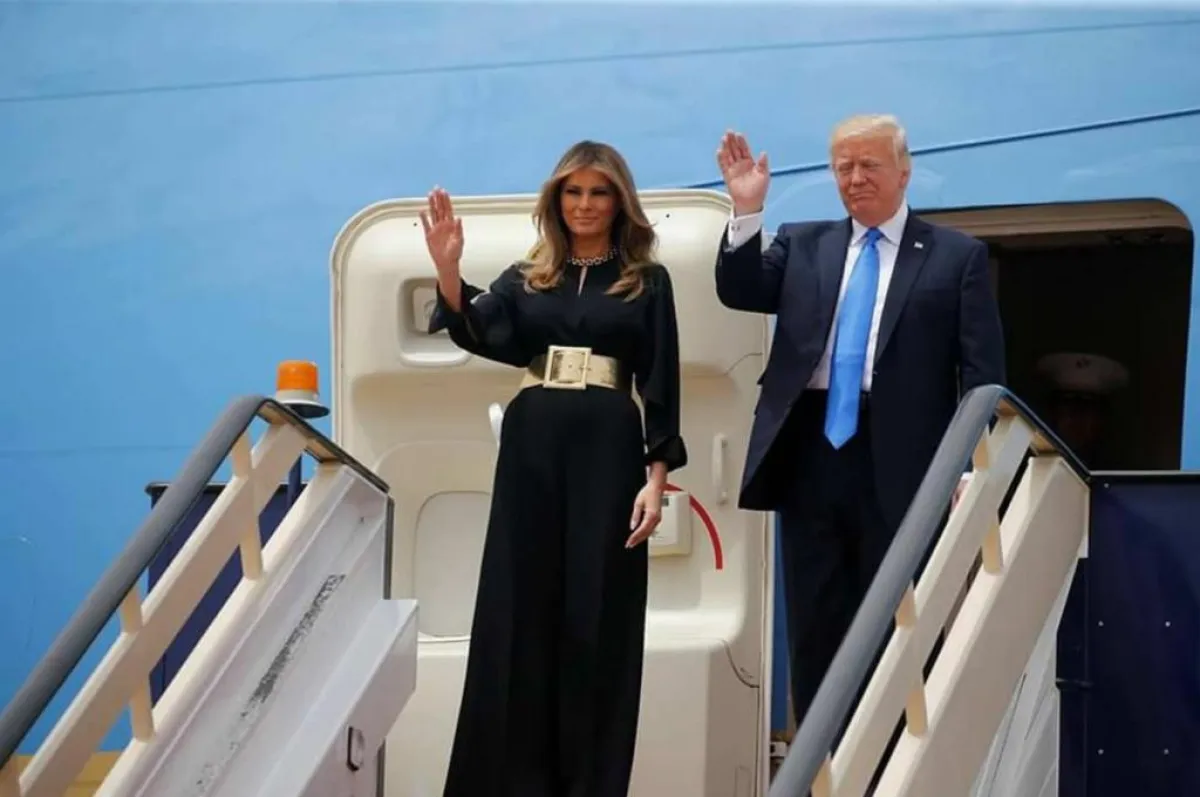 وغادرت زوجة الرئيس ترامب واشنطن مرتدية بلوزة بيضاء وتنورة برتقالية قصيرة، إلا أنها استبدلت بها ملابس محتشمة داخل الطائرة خلال الرحلة التي استغرقت 14 ساعة لوصولهم للملكة العربية السعودية.