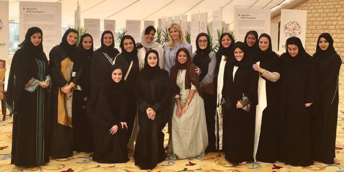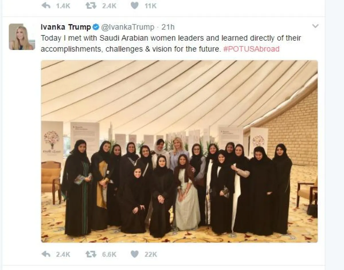 وقالت إيفانكا في تغريدتها: "التقيت اليوم بقيادات نسائية سعودية، وتعلمت بشكل مباشر من إنجازاتهن، والتحديات التي تواجههن، والرؤى المستقبلية". كما أشادت في تغريدتها بالقيادات النسائية السعودية أثناء زيارتها مع والدها الرئيس الأمريكي دونالد ترامب السعودية.