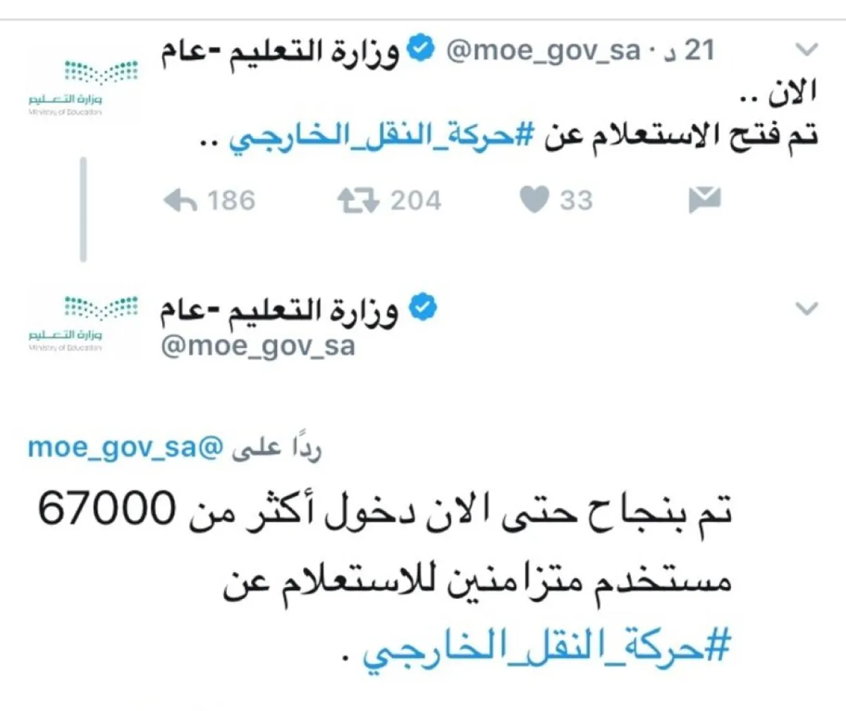 ذكرت وزارة التعليم أن 67 ألف مستخدم دخلوا لنظام الاستعلام عن حركة النقل بعد 15 دقيقة من فتحه مرة أخرى، ويأتي ذلك بعد أن أعلنت الوزارة يوم أمس الأحد عن فتح الاستعلام عن حركة النقل الخارجي للمعلمين والمعلمات، بعد تعطل النظام خلال اليومين الماضيين.