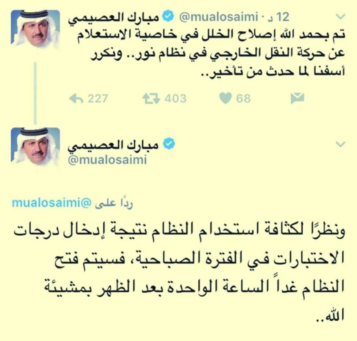 ووفقاً لـ«24»، فقد أعلن المتحدث الرسمي للوزارة مبارك العصيمي، عن إصلاح الخلل على أن يتم فتح النظام الساعة الواحدة ظهراً نظراً لكثافة استخدام النظام بسبب إدخال درجات الاختبارات في الفترة الصباحية، فيما قدم وزير التعليم الدكتور أحمد العيسى اعتذاره للمعلمين والمعلمات عن هذا الخلل.