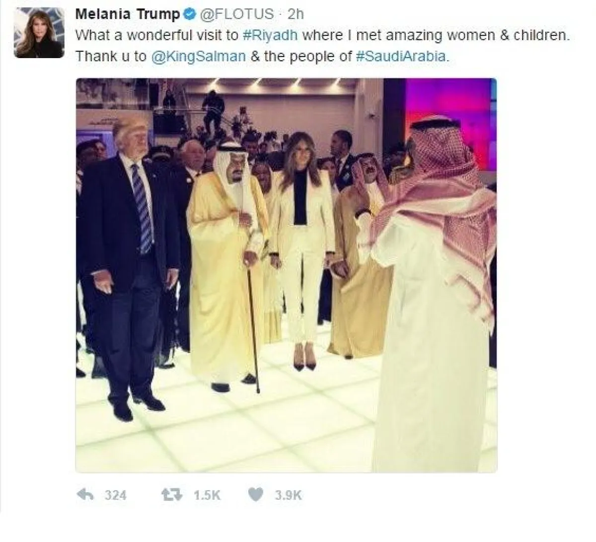 في ختام الزيارة الرسمية التي قام بها الرئيس الأمريكي دونالد ترامب للسعودية، وجَّهت زوجته ميلانيا، التي رافقته خلال الزيارة، شكرها إلى الملك سلمان والشعب والسعودي عبر تغريده في صفحتها على "تويتر".