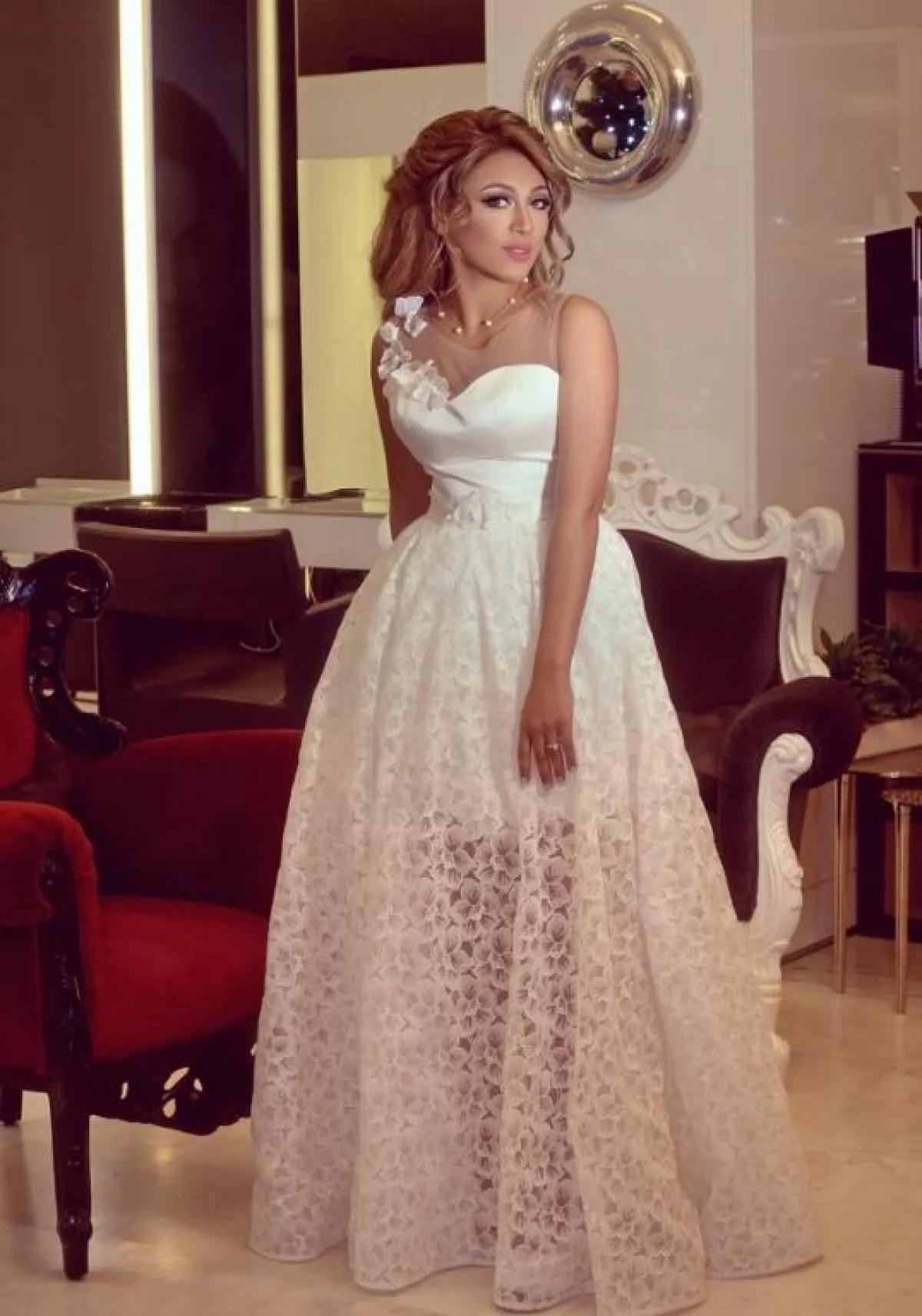 أخيرًا تمّ تزيين الشعر بورود من موديل الفستان نفسه.