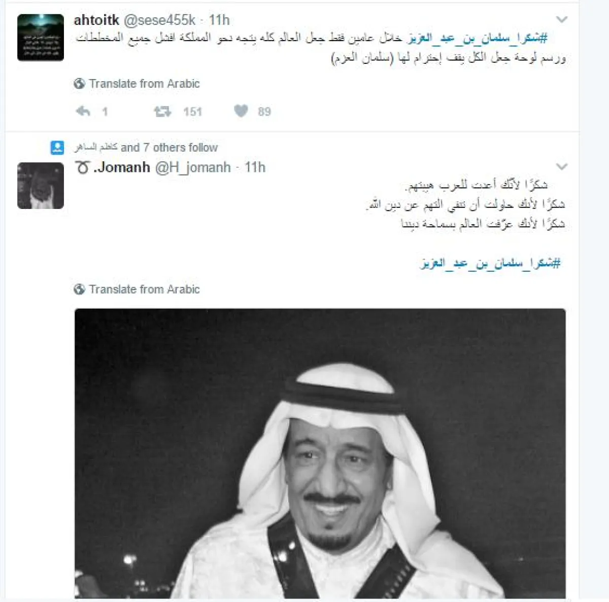 في حين غرد أمين الزهراني @Amin_Alzhrani قائلاً: "في يومين جمعت هؤلاء تحت راية التوحيد، وفي يومين أنشأت شركات صناعية، واستثمارات ووظائف لشعبك، فـ #شكرا_سلمان_بن_عبد_العزيز".