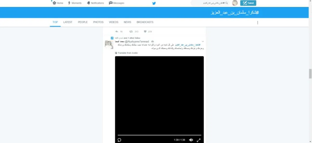 في حين قالت جواهر المرطفي @jig7869 : "#شكرا_سلمان_بن_عبد_العزيز أعدت للأمة الإسلامية هيبتها، وجمعتها على قلب واحد. ما علينا دام سلمان راسه فالوجود حاكم وفي وشعب يجي حسب طلبه".