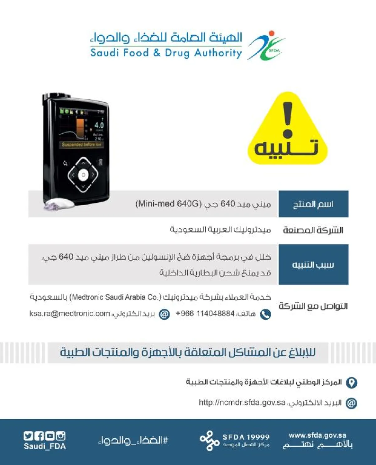 نبهت الهيئة العامة للغذاء والدواء السعودية إلى وجود خلل في برمجة أجهزة ضخ الأنسولين من طراز ميني ميد 640 جي "Mini-med 640G"، التي تصنعها شركة ميدترونيك العربية السعودية.
