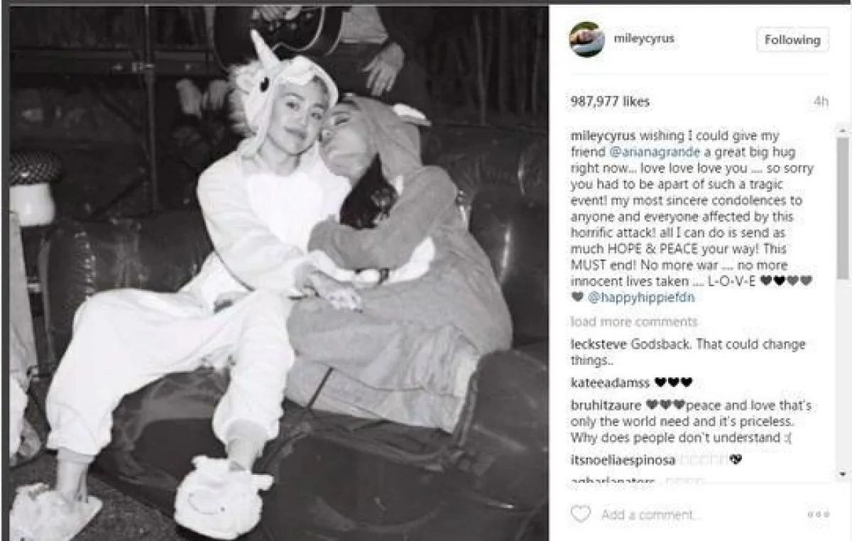 وكانت النجمة العالمية مايلي سايرس Miley Cyrus قد نشرت عبر "انستقرام"، صورة تجمعها بالمغنية غراندي وعلقت عليها: "كنت أتمنى أن أعانق صديقتي عناق كبير الآن، أحبك كثيراً، وأشعر بالأسف لكونك جزءاً من هذا الحادث المأساوي".