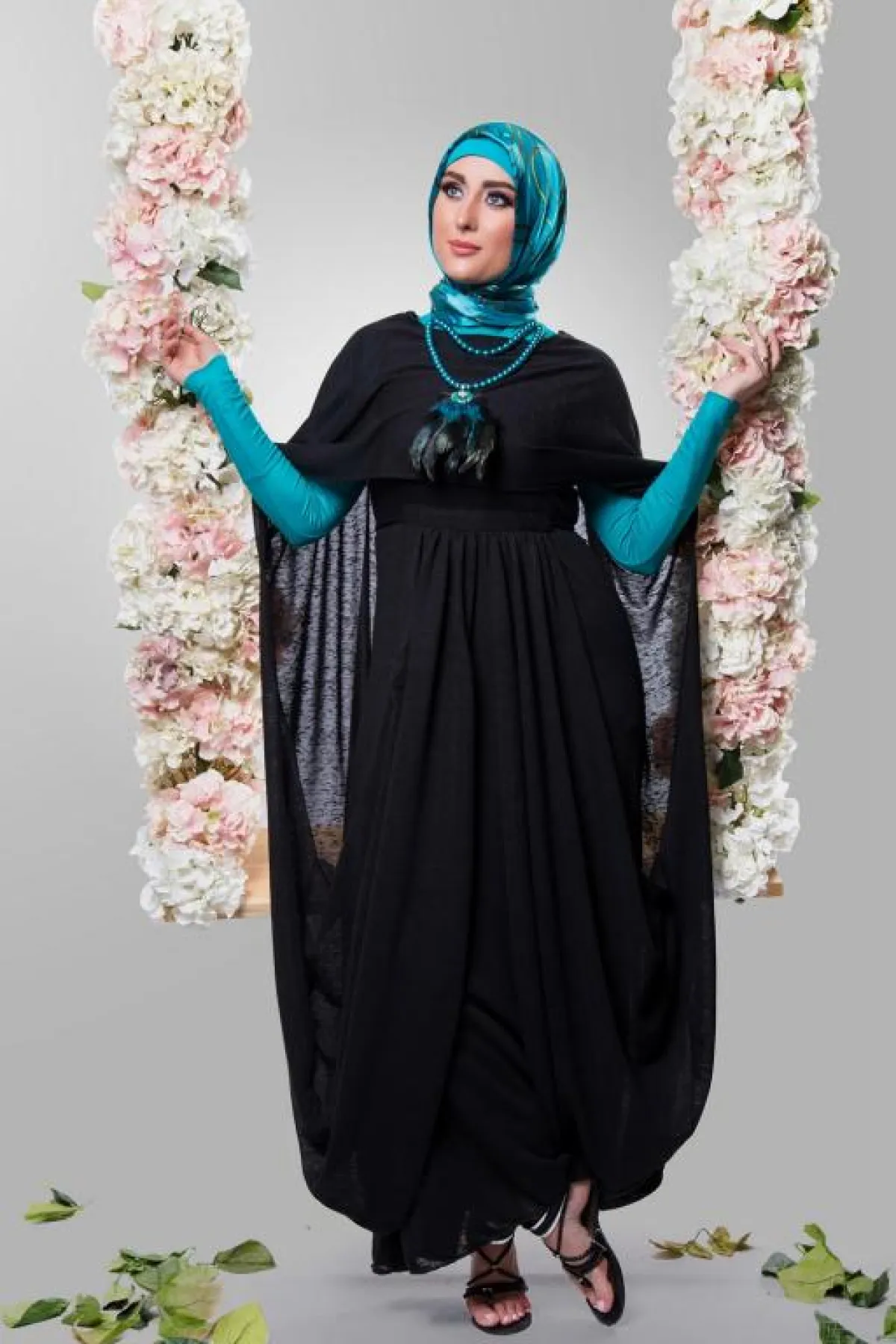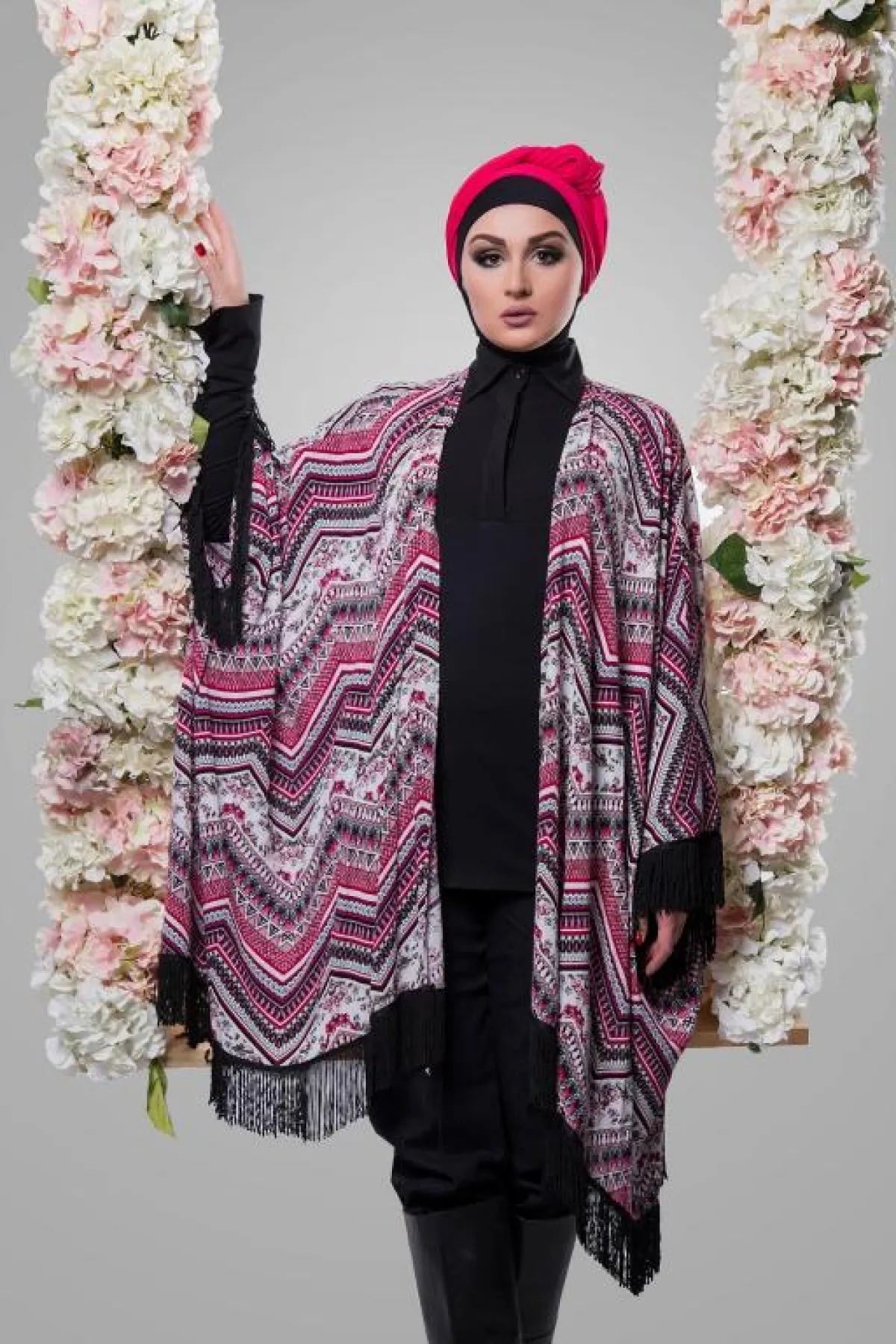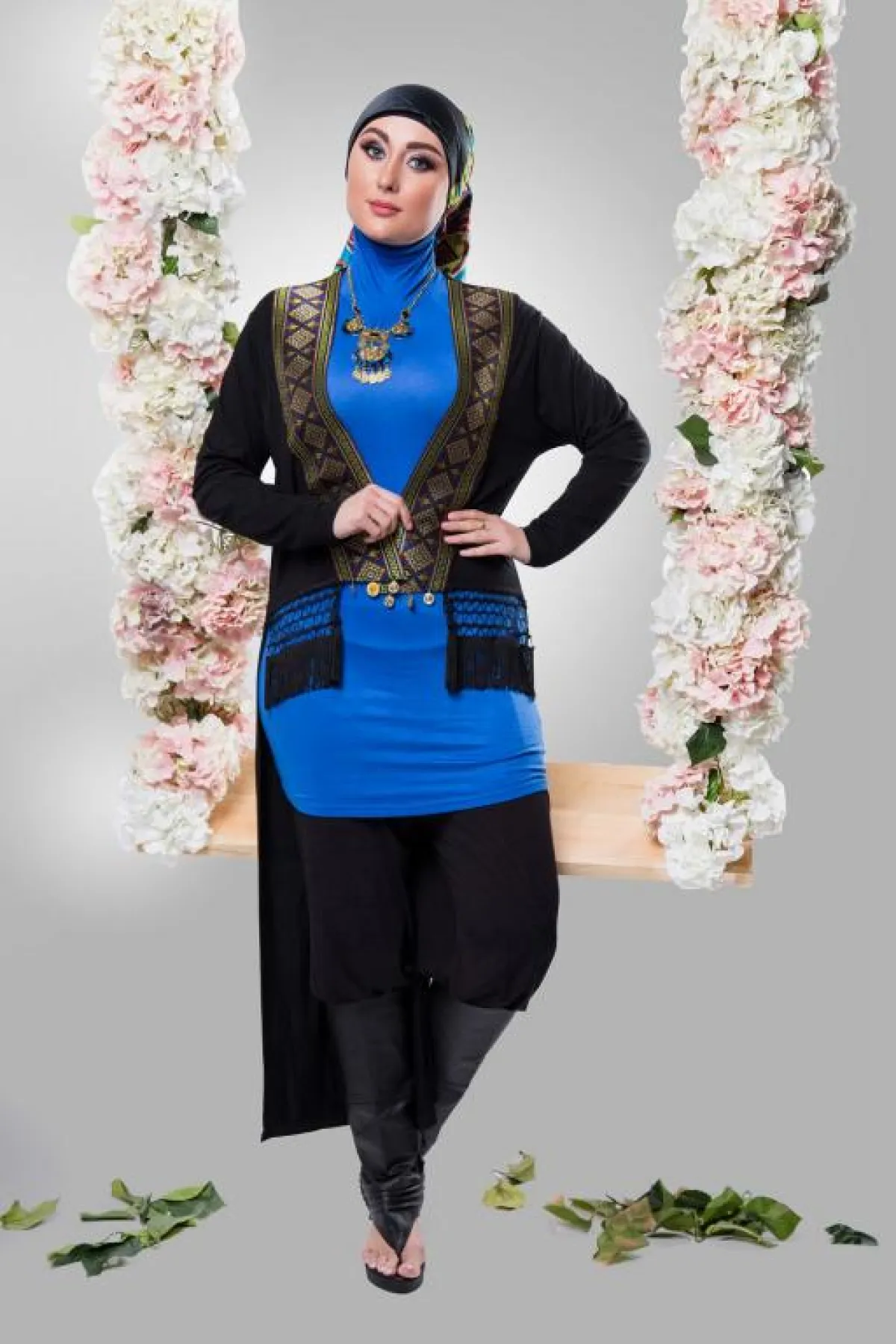 أما ملبس "الكاربلين بشراشيب سوداء وبوت اسود" فهو موضة جديدة يتم لبسها على السراويل الواسعة وتصلح لحضور السحور والافطار وهو من قماش الشيفون
