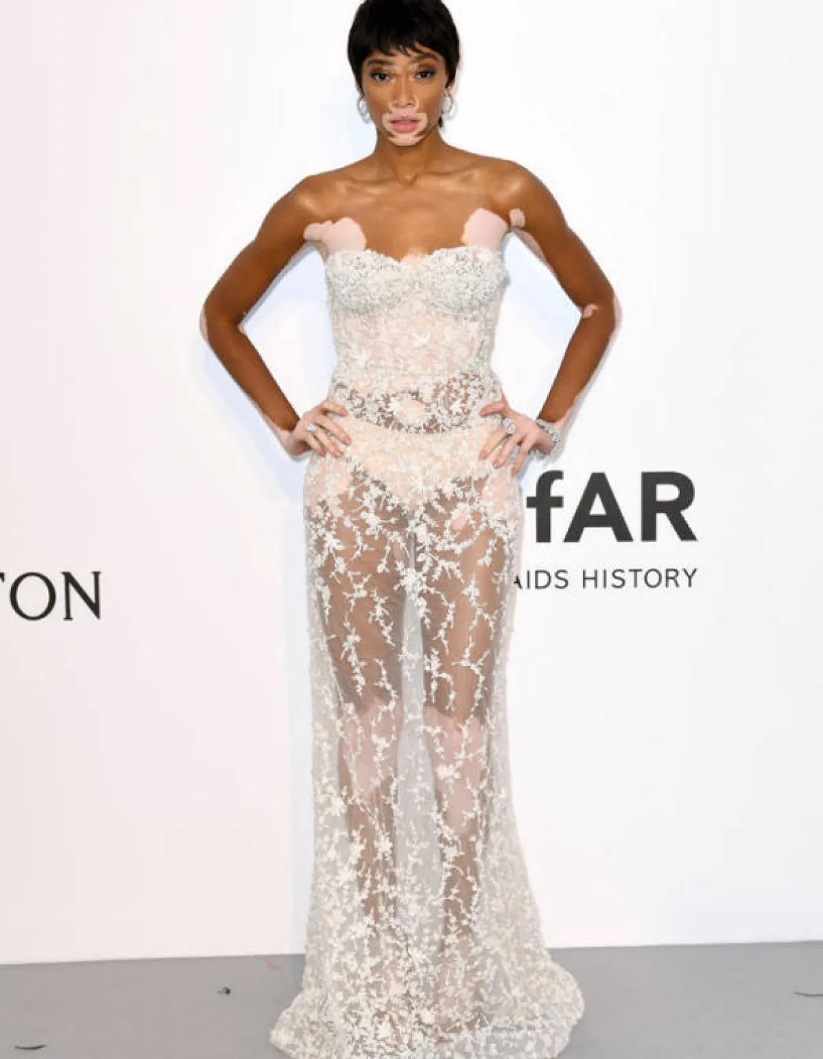 وكذلك فقد اختارت عارضة الأزياء المثيرة للجدل "ويني هارلو" Winnie Harlow أيضاً فستان شفاف بالكامل باللون الأبيض، وكأنهن يرغبن بلفت الأنظار من خلال هذه التصاميم.