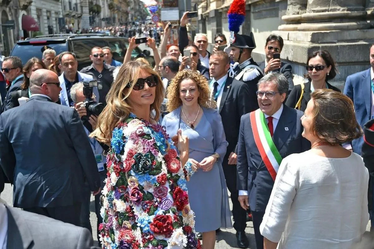 رافقت "ميلانيا ترامب" Melania Trump زوجها رئيس الولايات المتحدة "دونالد ترامب" Donald Trump في جولته العالمية لعدد من دول الشرق الأوسط وأوروبا، وعند وصولهما لايطاليا قررت "ميلانيا" Melania أن تختار اطلالاتها من دار أزياء ايطالية، وطبعاً حالياً لايوجد دار أكثر شهرة من "دولتشي أند غابانا" Dolce&Gabbana ولهذا فقد شاهدناها في عدد من الاطلالات الأنيقة والمميزة التي حملت توقيع الدار العريقة، ومؤخراً وفي زيارة لها لمدينة صيقيليا تألقت "ميلانيا" Melania في سترة مزيّنة بورود ثلاثية الأبعاد وملونة اختارتها من مجموعة "دولتشي أند غابانا" Dolce&Gabbana لموسم خريف وشتاء 2017-2018 وصلت قيمتها الى 51,500 دولار أمريكي، وهذه القطعة الفنية توفرت للبيع بشكل محدود في عدة متاجر للدار ومتاجر الكترونية، لكنها ما لبثت أن نفذت من الأسواق وخاصة بعد أن اختارتها "ميلانيا ترامب" Melania Trump بالرغم من ثمنها الباهظ.