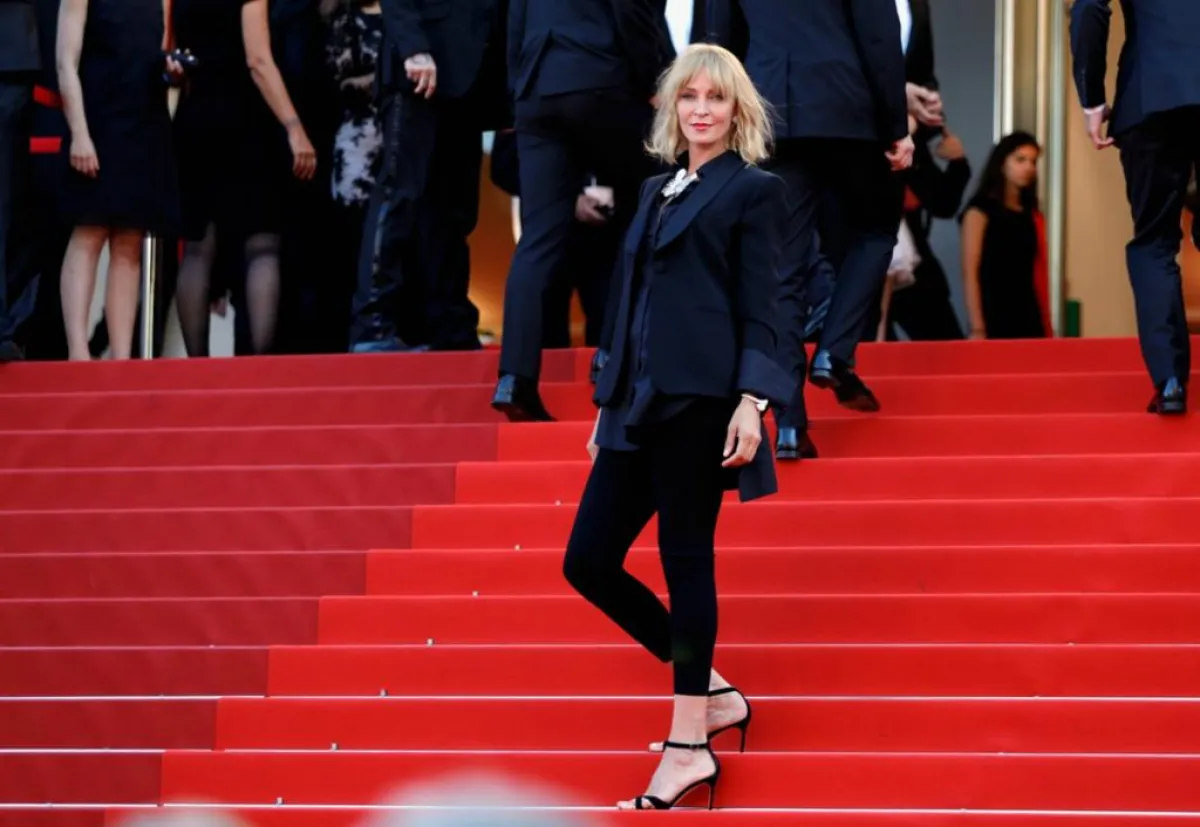 وكذلك فقد شاهدنا النجمة "اوما ثيرمان" Uma Thuman والتي اختارت بدلة باللون الأسود بلمسة ذكورية، وزينت اللوك بعقد ماسي لافت.