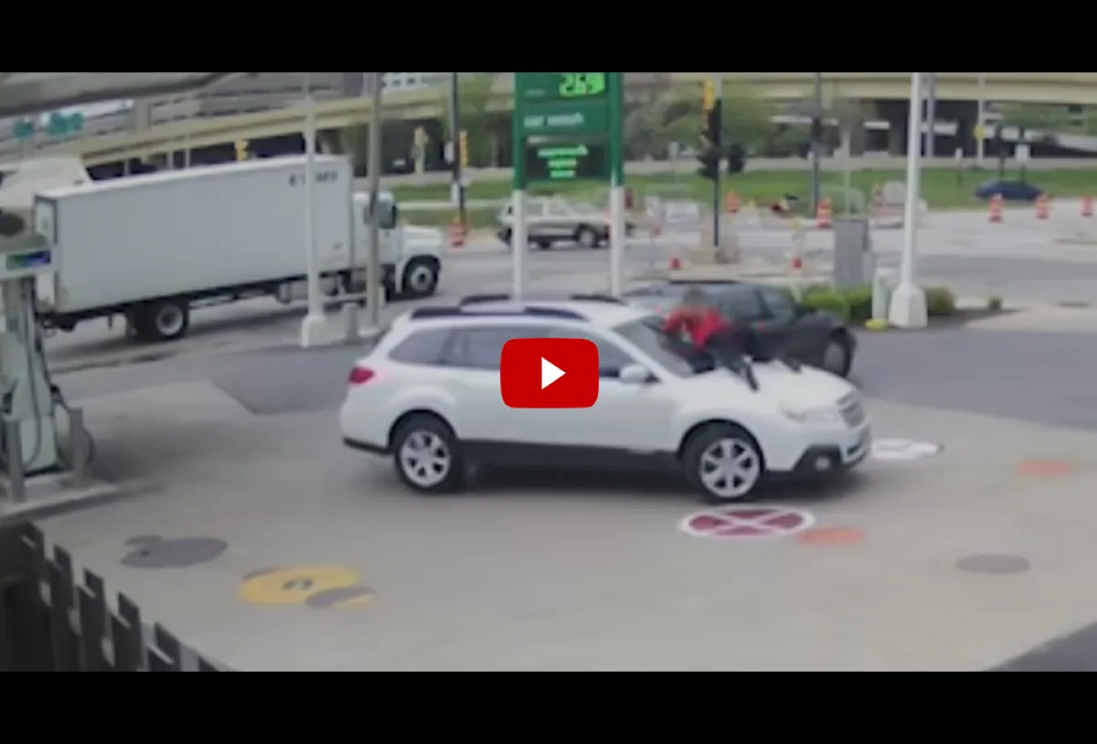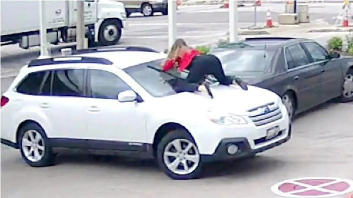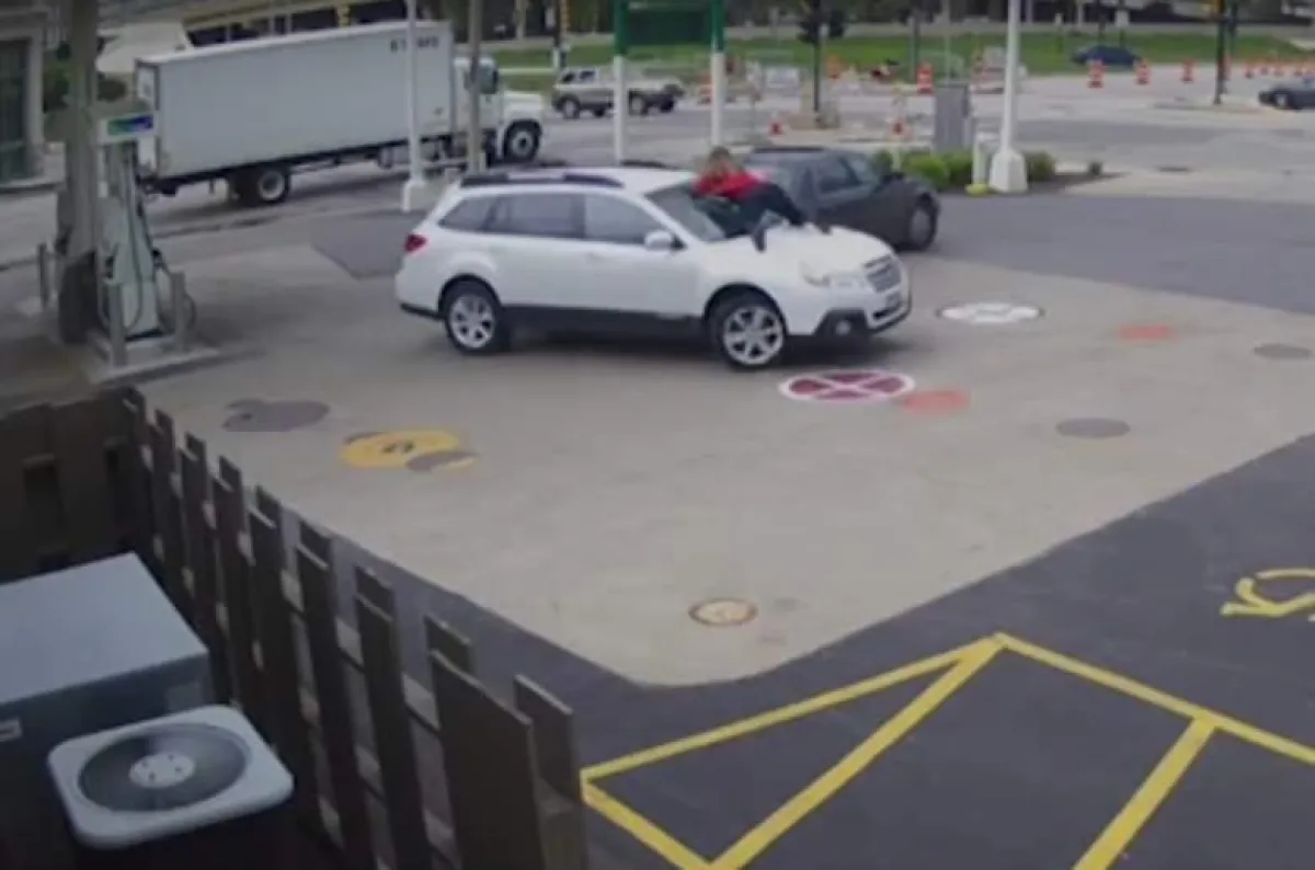 وعلى الفور قفزت الشابة على مقدّمة السيارة في محاولةٍ منها لإيقاف السارق من الخروج بها من المحطة.