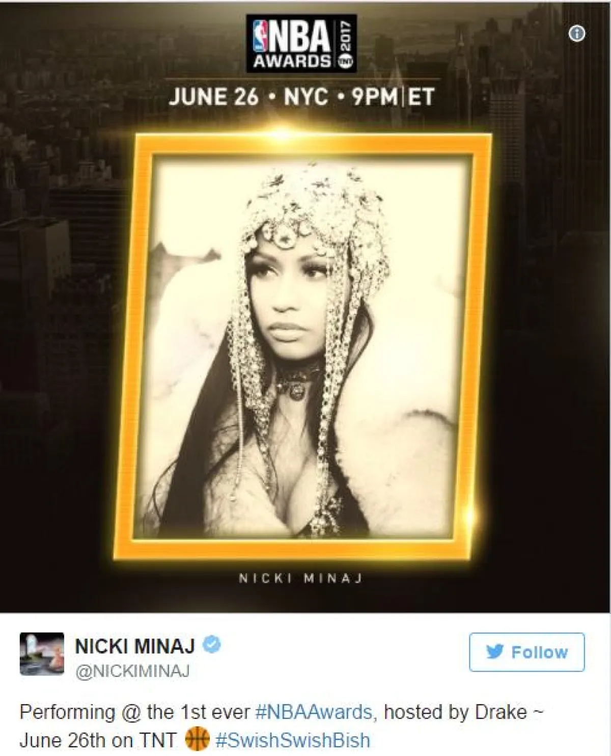 أكدت إدارة الرابطة الوطنيّة لكرة السلة في الولايات المتحدة الأمريكيّة، أنّه قد تمّ اختيار مغنّي الراب الكندي الشهير دريك Drake لتقديم حفل جوائز الرابطة NBA Awards السنوي، الذي يقام في 26 يونيو/حزيران المقبل في مدينة نيويورك.