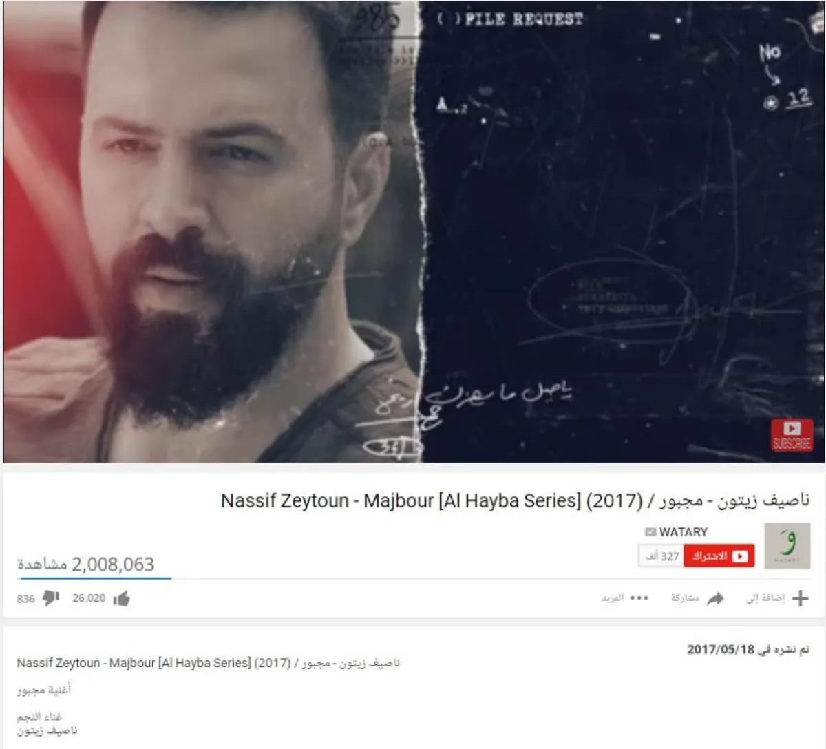 1- ناصيف زيتون احتلّ المركز الأول بأغنية مجبور، شارة مسلسل "الهيبة" للنجم تيم حسن، وهي من كلمات علي المولى، وألحان فضل سليمان وحققت 2,008,063 مشاهدة