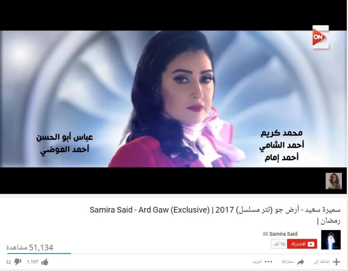 13- مفاجأة قائمة أكثر شارات رمضان، مشاهدة في تراجع المطربة الكبيرة سميرة سعيد التى قدّمت أغنية مسلسل "أرض جو" للنجمة غادة عبد الرازق وحققت51,134 مشاهدة فقط.