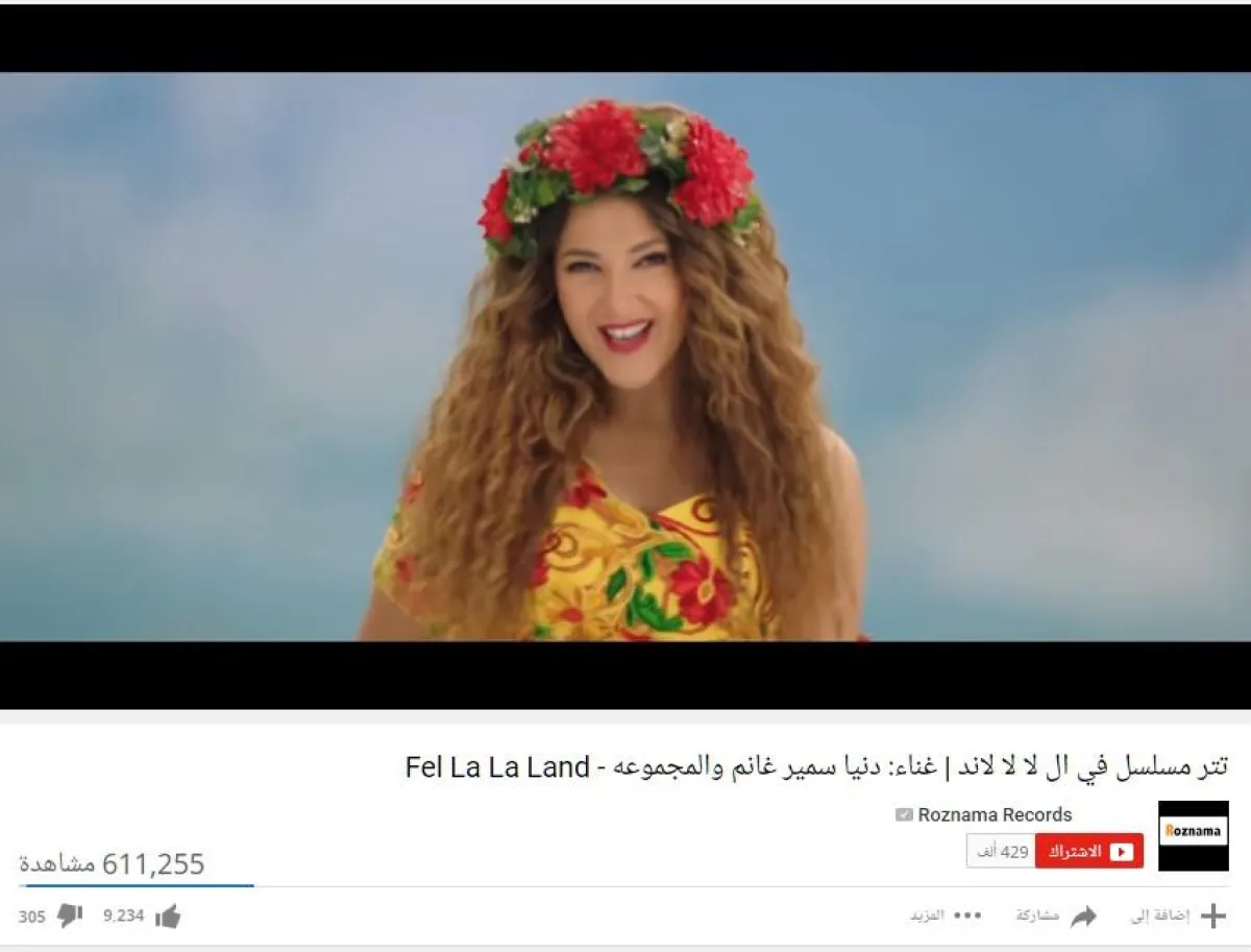 8- تيتر مسلسل في الـ "لا لا لاند"، يعدّ أول أغنية جماعيّة تتصدر قائمة الأكثر مشاهدة، وهو من غناء دنيا سمير غانم ومجموعة من نجوم المسلسل، فكرة وألحان هشام جمال، وكلمات أمير طعيمة، وتوزيع مادي وحقق 611,255 مشاهدة.