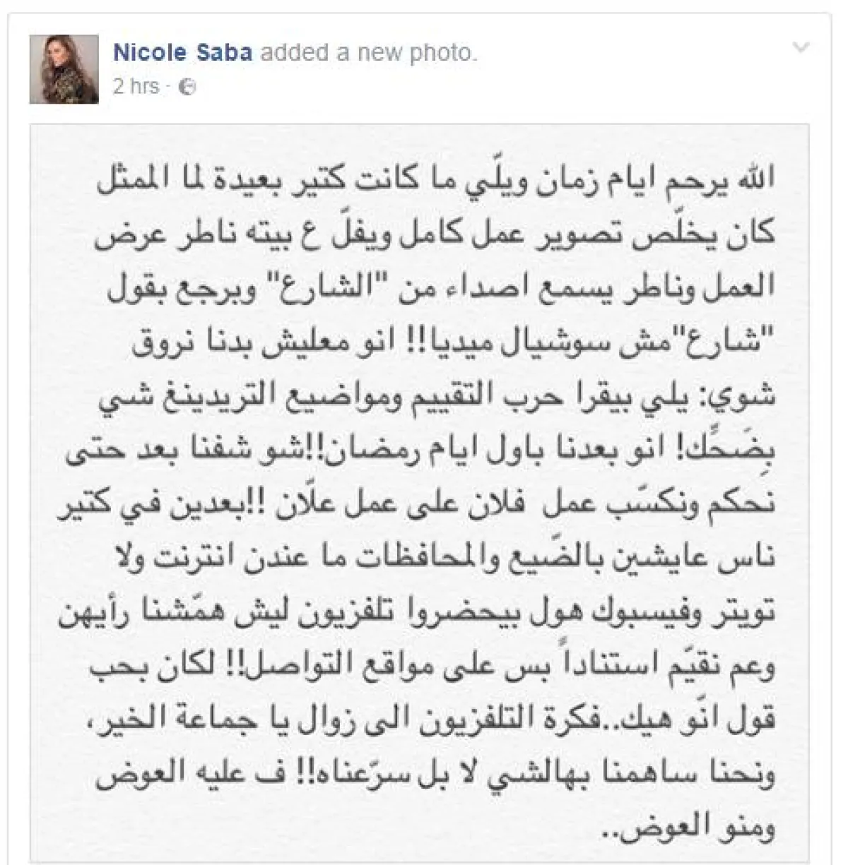 وسخرت نيكول من "التراند" الذي يصنّف الأعمال بحسب أولويّتها، وقالت: "إنو معليش بدنا نروق شوي: يلّي بيقرا حرب التقييم ومواضيع التراندينغ شي بضحّك ! إنو بعدنا بأول أيام رمضان!! شو شفنا بعد حتى نحكم ونكسّب عمل فلان على عمل علّان!! بعدين في كتير ناس عايشين بالضّيع والمحافظات، ما عندن إنترنت ولا تويتر ولا فيس بوك، هول بيحضروا تلفزيون، ليش همّشنا رأيهن، وعم نقيّم استنادًا بس على مواقع التواصل !! لكان بحب قول إنو هيك..فكرة التلفزيون إلى زوال يا جماعة الخير، ونحنا ساهمنا بهالشي لا بل سرّعناه!! فعليه العوض ومنو العوض".