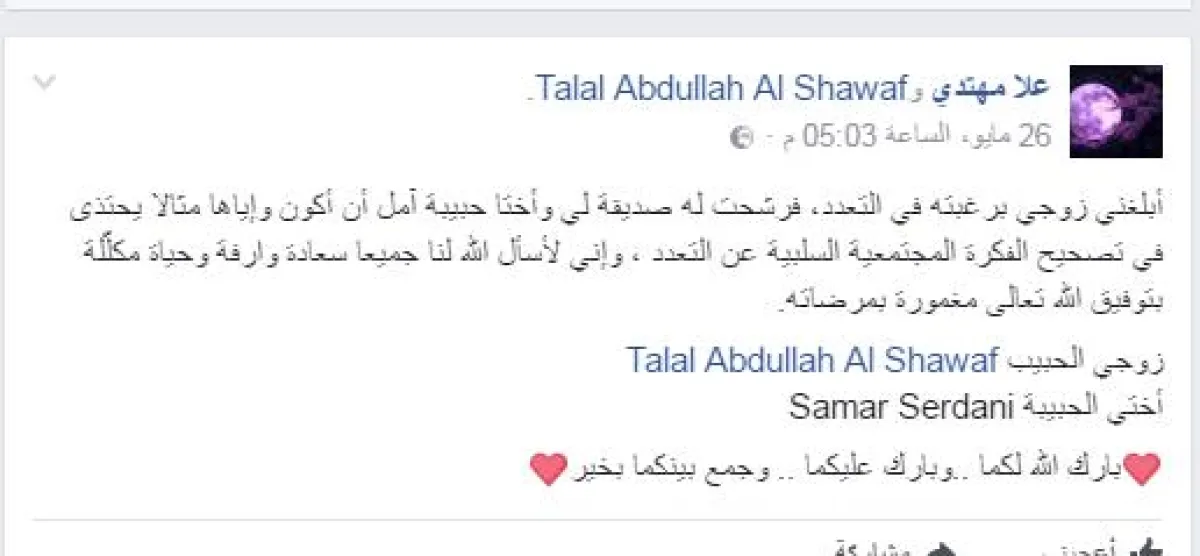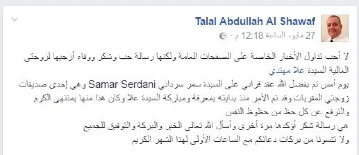 وأضافت: "زوجي الحبيب طلال عبد الله الشواف وأختى الحبيبة سمر سرداني بارك الله لكما.. وبارك عليكما.. وجمع بينكما في خير".