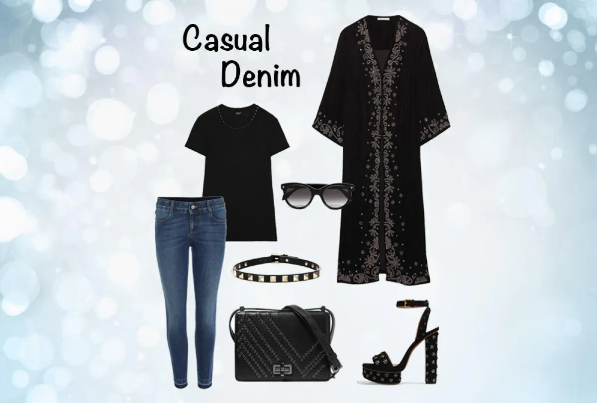 بإمكانك أن تنسقي بنطلون الجينز الأزرق مع العباية الشرقية التقليدية بطرق رائعة وعصرية ومواكبة للموضة لكي تحصلي على إطلالة رمضانية بمنتهى الشباب والعملية. كما بإمكانك أن تمنحي هذه اللإطلالة لمسة أنثوية أنيقة من خلال تنسيق حذاء بكعب عالٍ مع الأزياء المختارة.