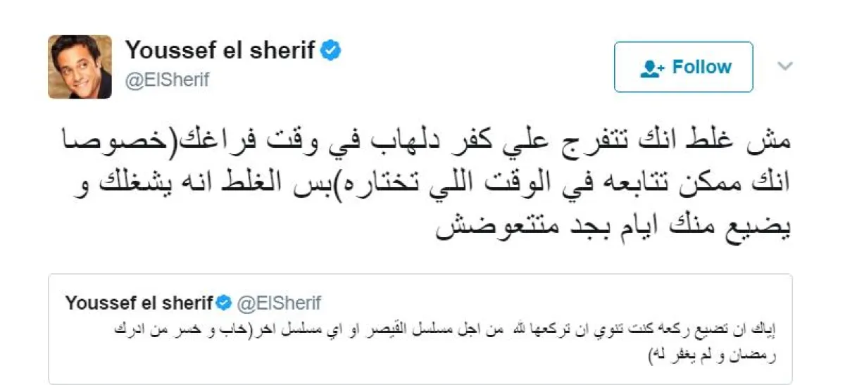 رغم تفوّق مسلسله الجديد "كفر دلهاب"، وتحقيقه نسبة مشاهدة عالية، استعاد الفنان يوسف الشريف تغريدة أطلقها العام الماضي، حذّر فيها جمهوره من متابعة دراما رمضان، والسهو عن العبادة، وأكد في التغريدة الجديدة، أنّ متابعة مسلسل "كفر دلهاب" يجب ألّا يشغل الجمهور عن أداء العبادات!!