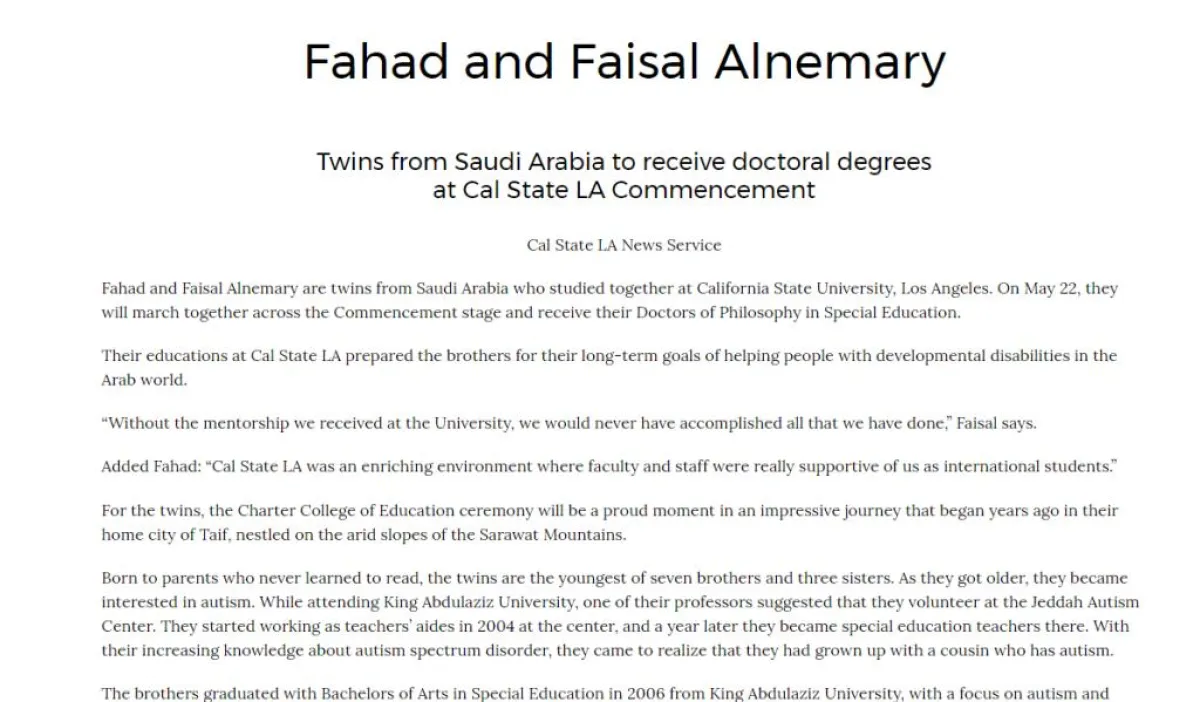 ووفقاً لموقع جامعة ولاية كاليفورنيا، فإن تتويج التوأم، وسيرهما معاً على المنصة للحصول على شهادة الدكتوراة، هو بمنزلة تتويج لرحلة مثيرة للإعجاب، بدأت منذ سنوات في مدينتهما الطائف، وانتهت في لوس أنجلوس. وأضاف الموقع أن فهد وفيصل ولدا لوالدين لم يتعلما القراءة، وهما الأصغر من بين 7 أشقاء و3 شقيقات ومع تقدمهما في السن، أصبحا مهتمين بمرض التوحد.