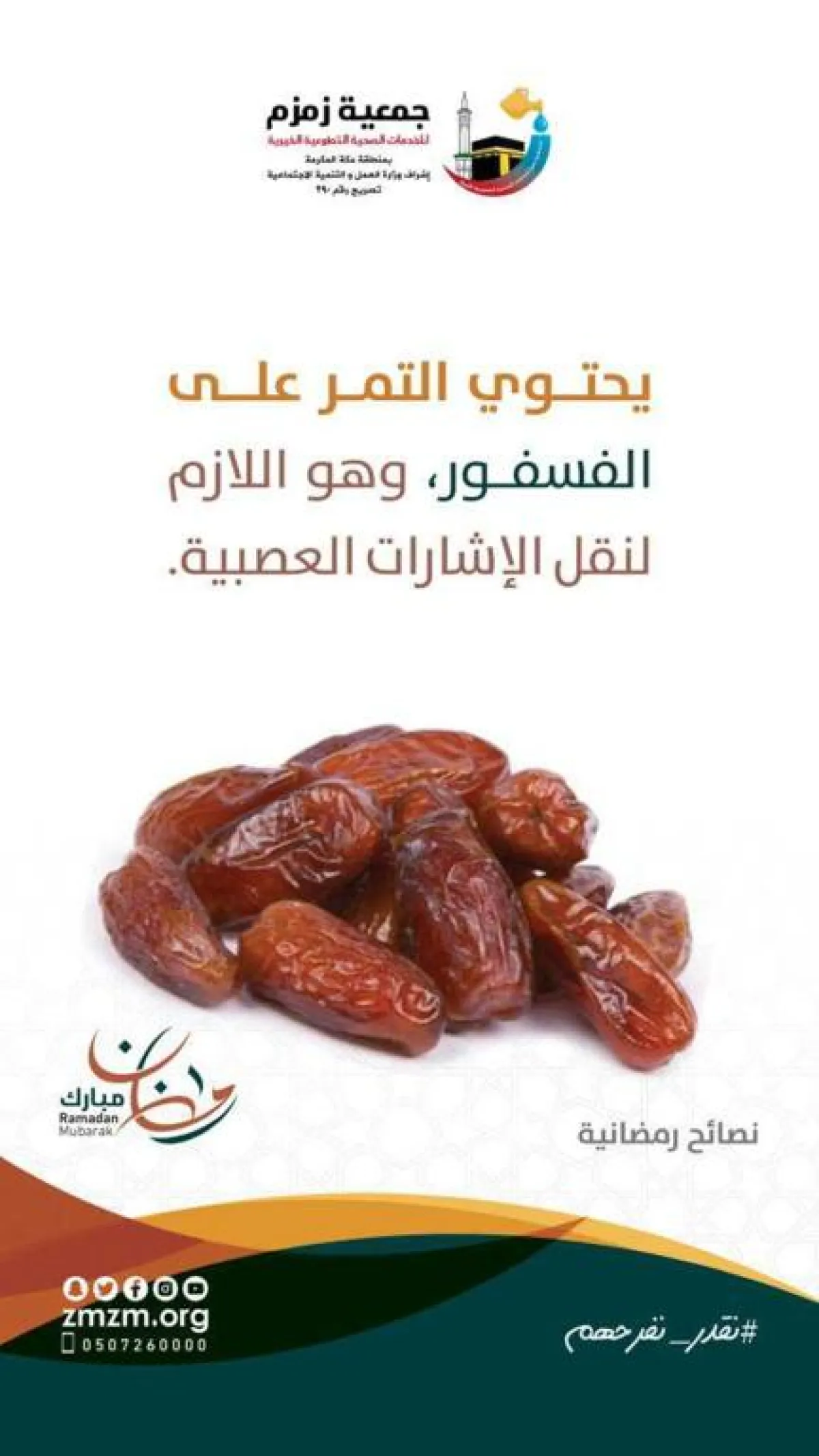 أوصت جمعية زمزم للخدمات الصحية والتوعية الخيرية، الصائمين بضرورة البدء بتناول التمر في وجبة الإفطار؛ تأسيًا بسنة النبي، صلى الله عليه وسلم، والذي كان يعجل فطره على تمرات وماء؛ إضافة إلى الفوائد العديدة التي يحتوي عليها التمر.