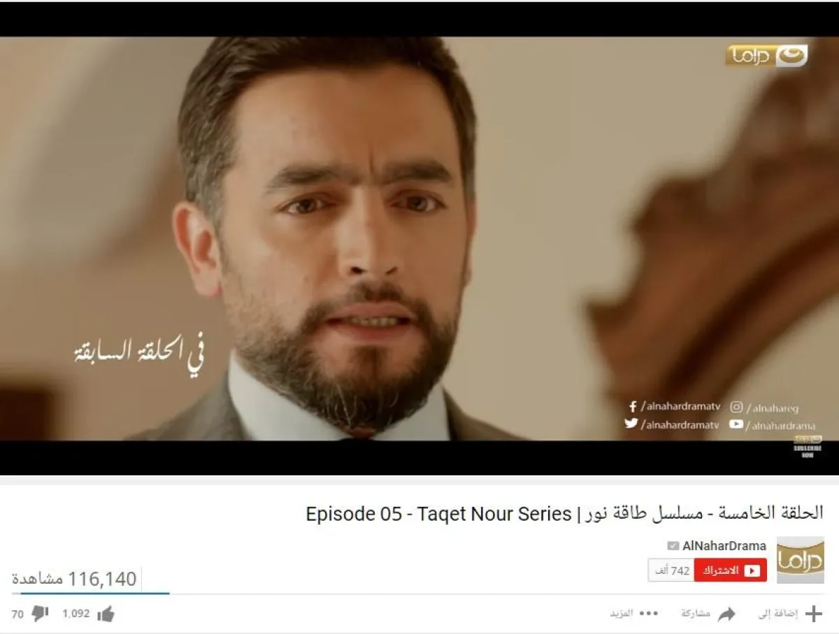 مسلسل "طاقة نور"، بطولة هاني سلامة، وميس حمدان، حققت الحلقة الخامسة 116,140 مشاهدة