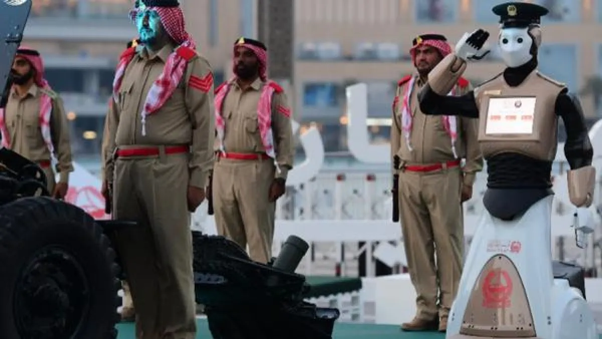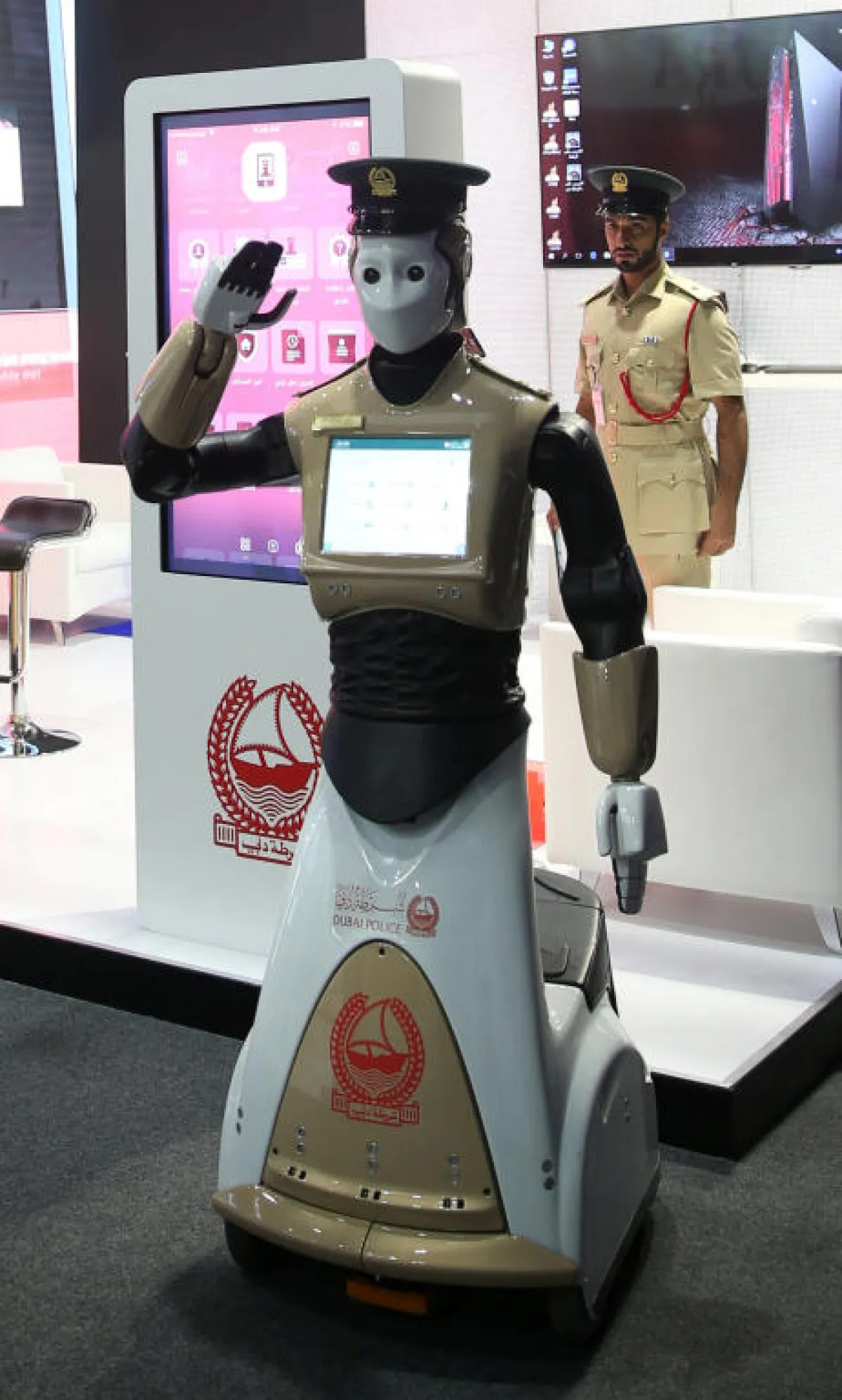 ظهر رجل الشرطة الآلي الذي أطلقته دبي خلال الشهر الماضي، أمس الأربعاء بجانب مدفع الإفطار في "الداون تاون" مقابل أعلى برج في العالم "برج خليفة"، وأدى التحية العسكرية، والتقط الحاضرون صوراً معه.