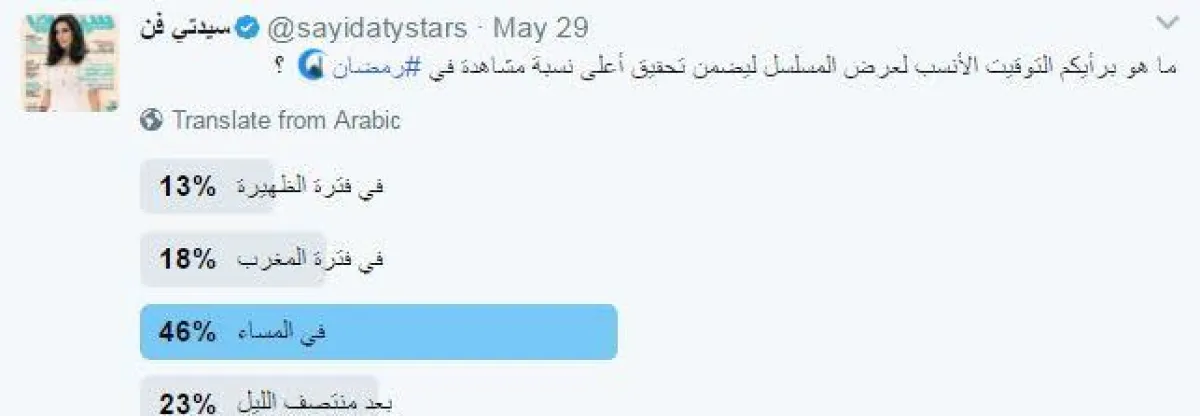 في استفتاء قام به حساب "سيدتي فن" التابع لـ"سيدتي نت" على موقع "تويتر"، عن التوقيت الأنسب لعرض مسلسلات شهر رمضان المبارك لتضمن تحقيق أعلى نسبة المشاهدة، جاءت الإجابات على الشكل التالي: