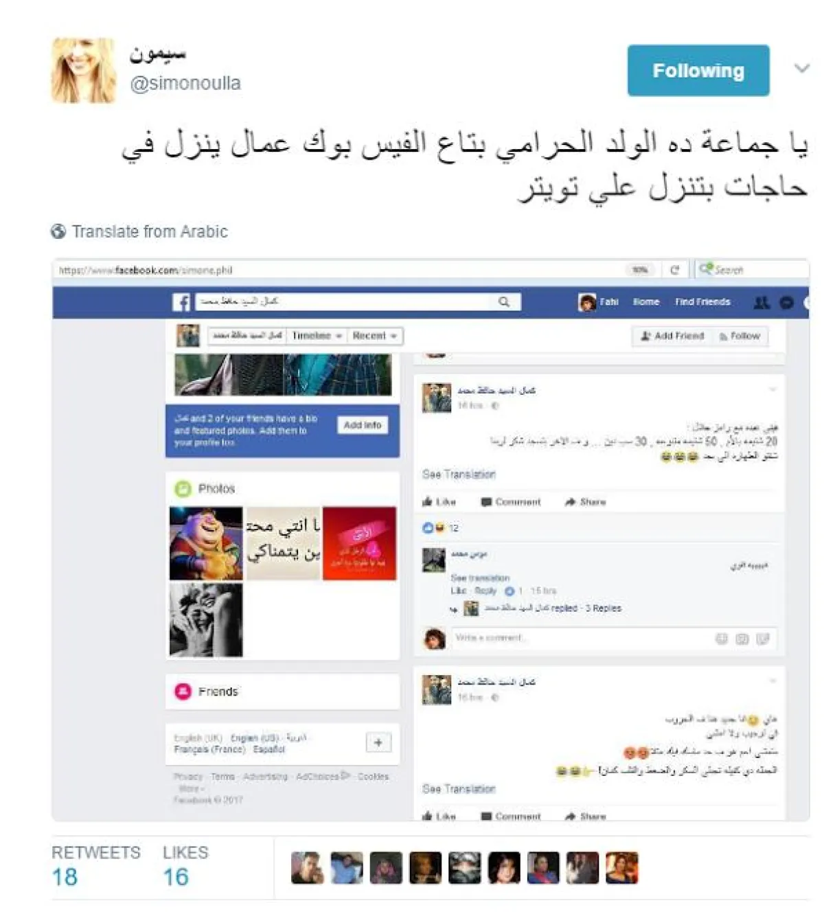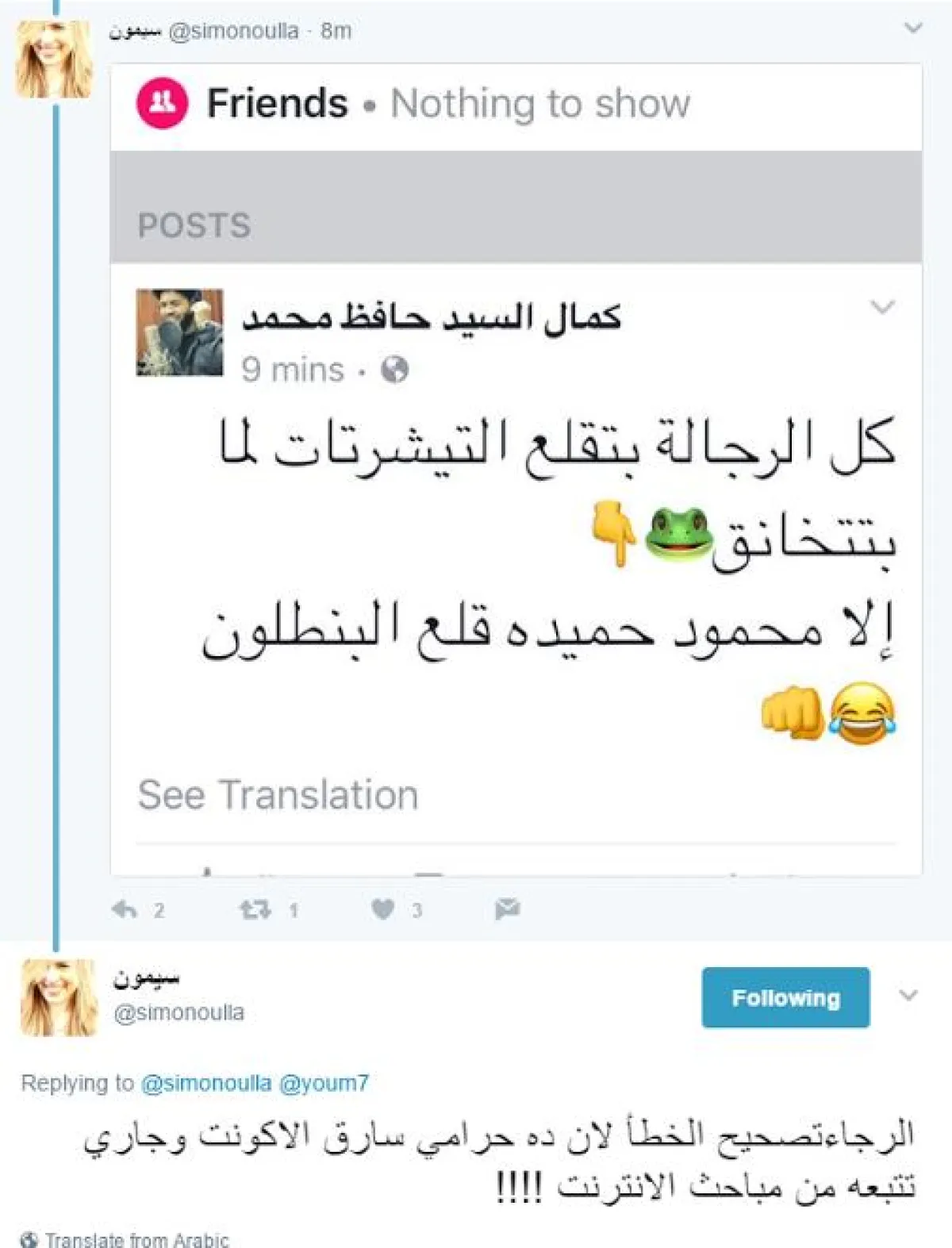 سيمون طالبت الجميع بتصحيح ما ينقل عنها من تغريدات تهاجم النجوم وقالت: "الرجاء تصحيح الخطأ لان ده حرامي سارق الاكونت وجاري تتبعه من مباحث الانترنت" !!!!