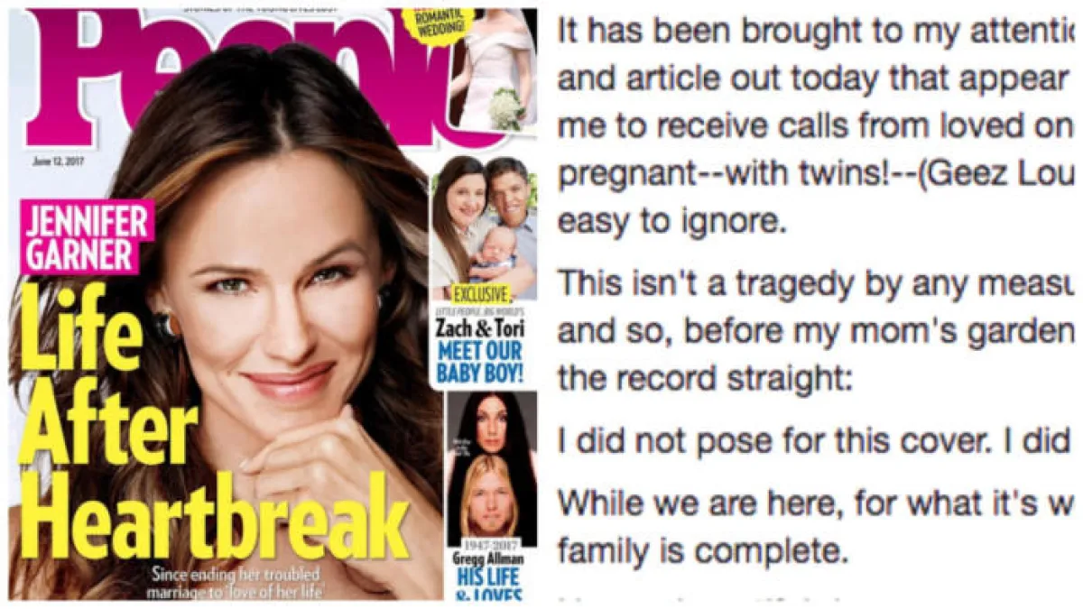 وقالت مجلة (People) في بيان لها يوم الخميس: "التقرير يتناول نجوم هوليوود المحبوبين من الجمهور وقصتنا عن جينيفر غارنر حقيقية. وفي الواقع لا تشمل القصة أي شائعات ولا تشير إلى أنها حامل. نتمنى لها الخير".