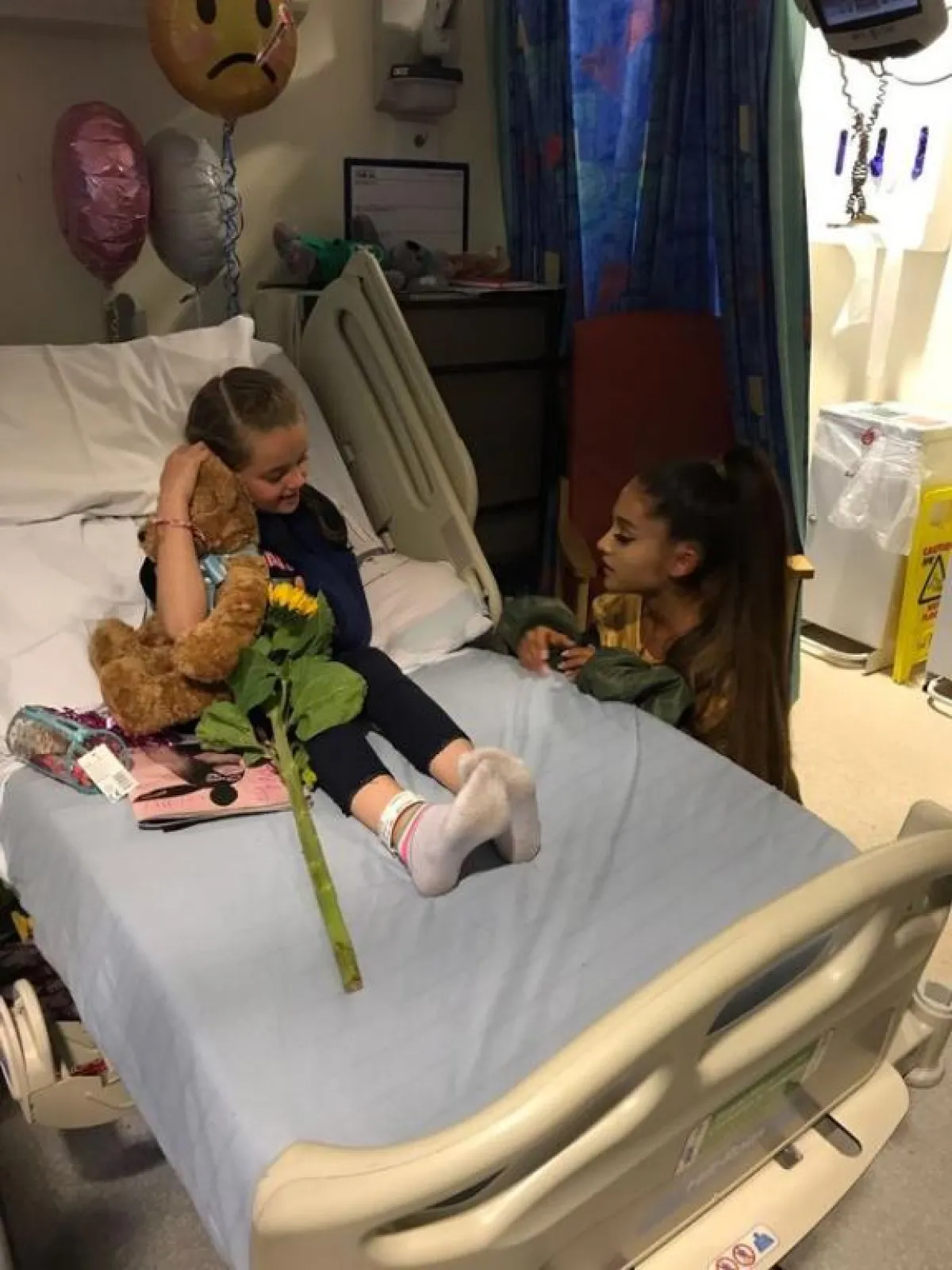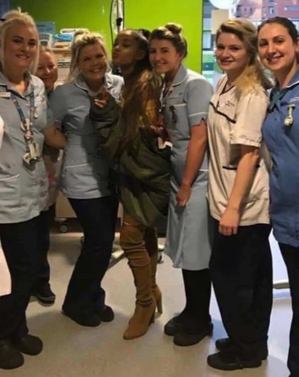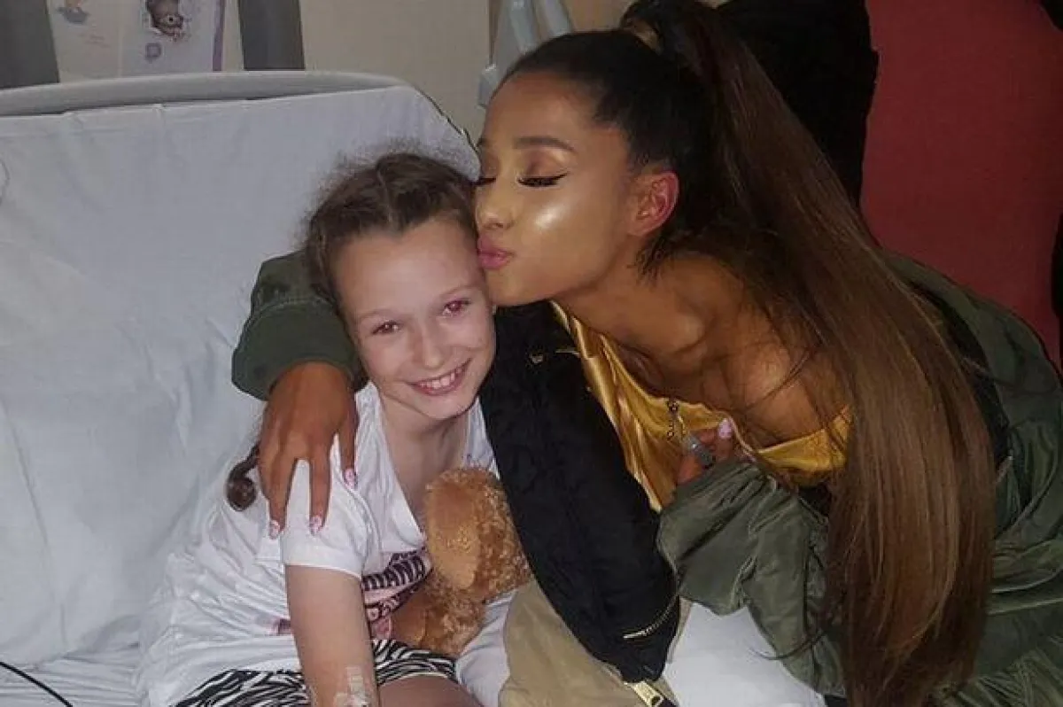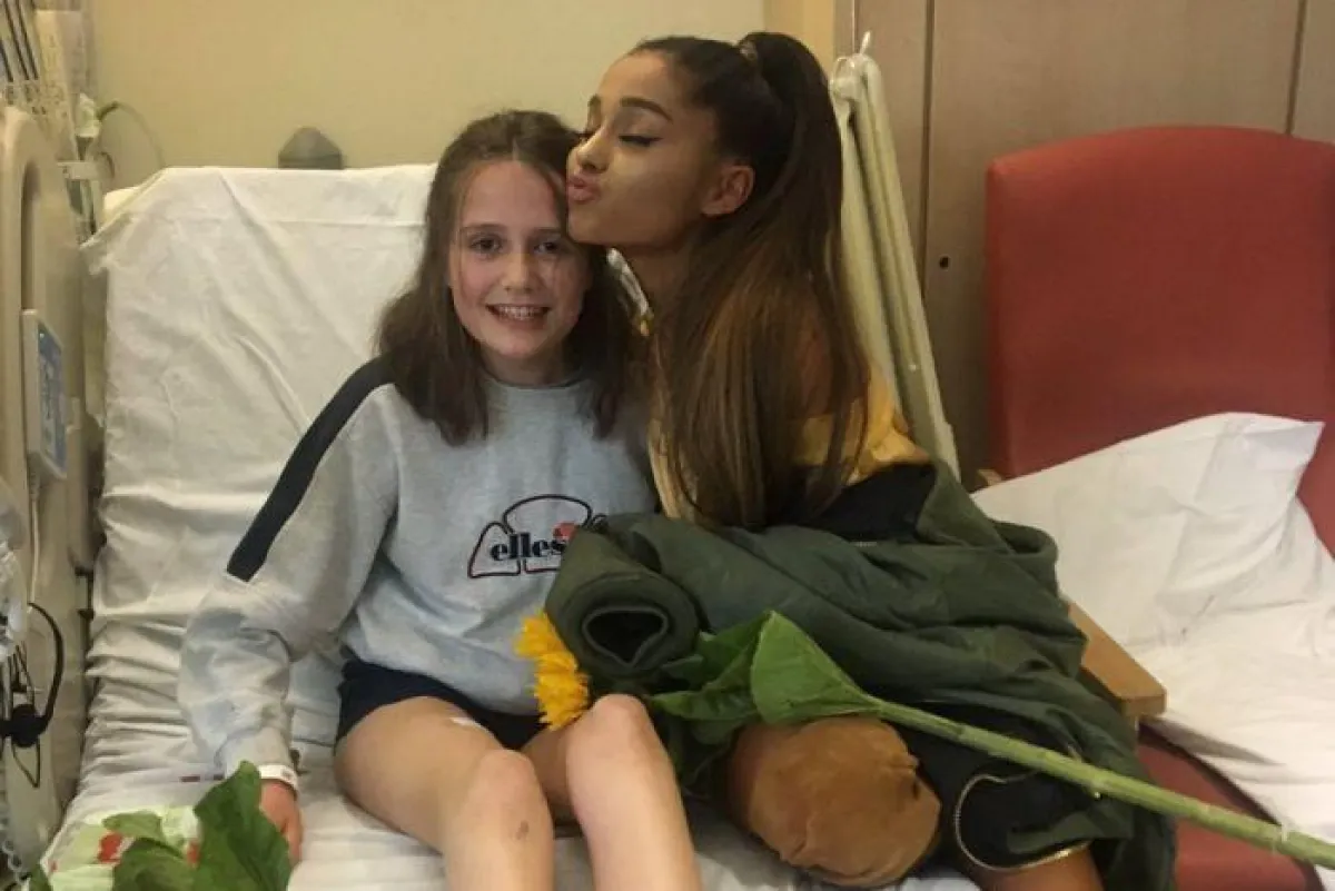 وزارت النجمة آريانا البالغة من العمر 23 عامًا، المصابات في التفجير الإرهابيّ الذي حصل في حفلها الأخير في مستشفى Royal Manchester Children.