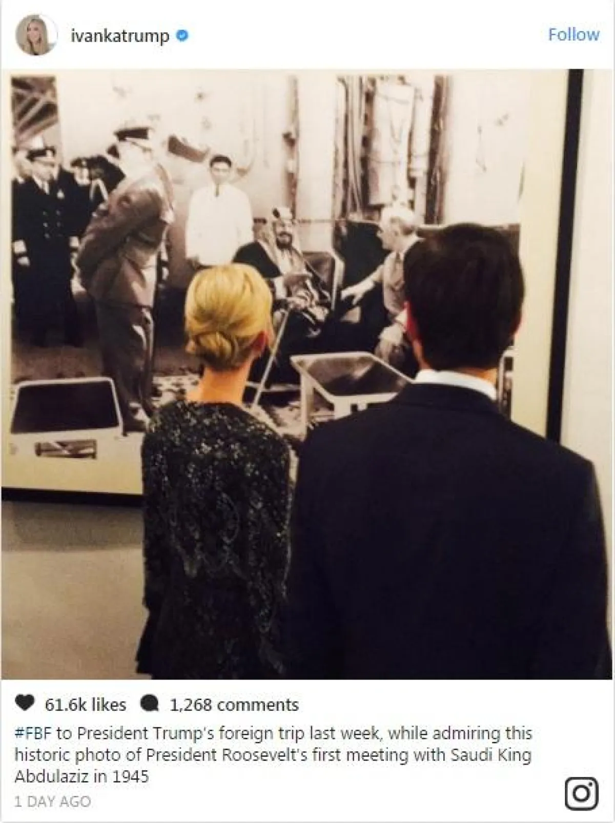 نشرت إيفانكا ترامب Ivanka Trump إبنة الرئيس الأمربكي دونالد ترامب Donald Trump، صورة عبر حسابها على موقع "انستقرام"، ظهرت فيها هي وزوجها جاريد كوشنر Jared Kushner وهما يقفان أمام صورة أرشيفية جمعت الملك السعودي الراحل عبد العزيز آل سعود ونظيره الأمريكي آنذاك ثيودور روزفلت Theodore Roosevelt عام 1945.