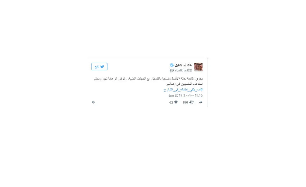 عليه، تفاعلت وزارة العمل والتنمية الاجتماعية مع حالة الأطفال الثلاثة، الذين ألقى والدهم بهم في الشارع، ويرقد أحدهم في مستشفى الولادة والأطفال بمكة المكرمة لتلقي العلاج من آثار التعنيف، وأكدت أنها ستقوم باستدعاء المتسببين في إهمالهم.