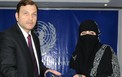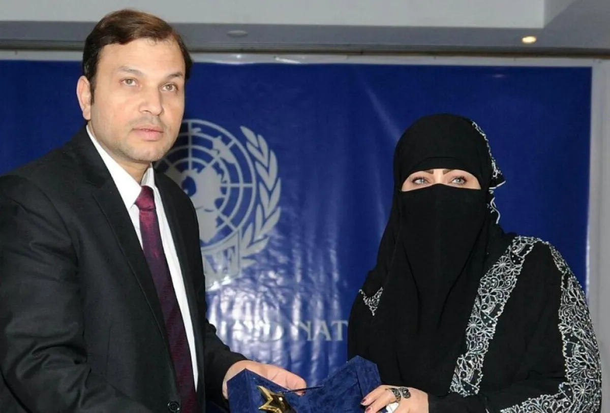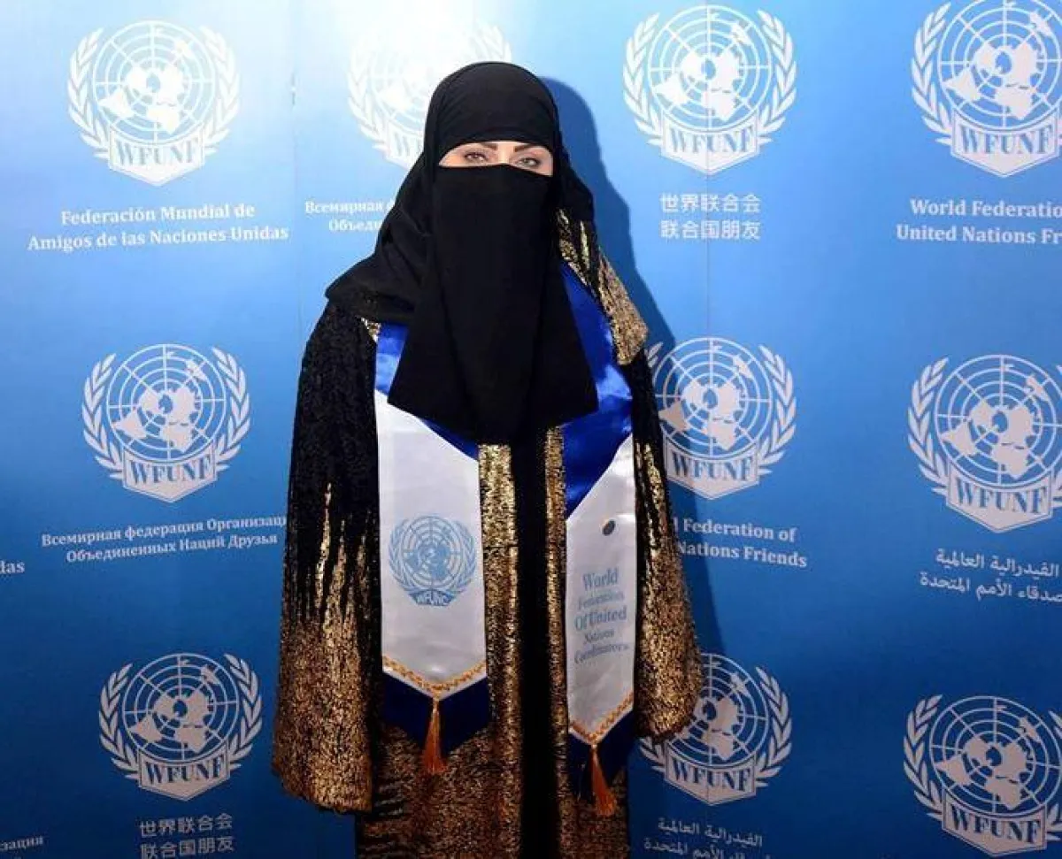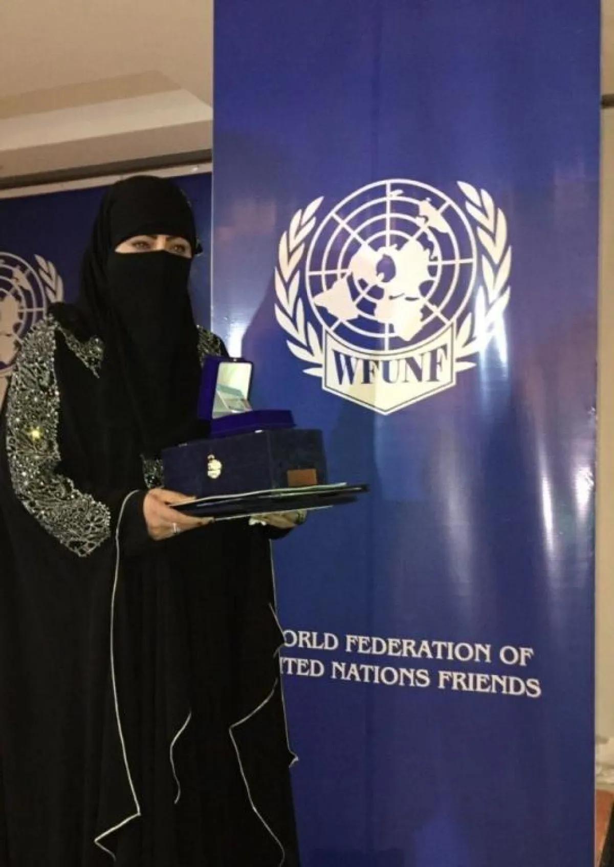 الدكتورة وفاء أبو هادي عندما كُرِّمت من قِبل منظمة الفيدرالية لأصدقاء الأمم المتحدة نظير جهودها المتميزة