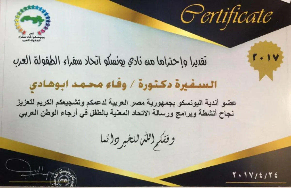 شهادة منحت للدكتورة وفاء عندما عينت سفيراً لـ "نادي يونسكو"