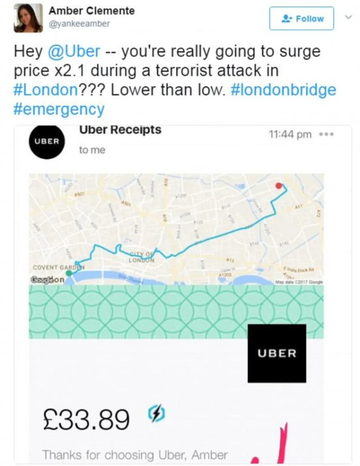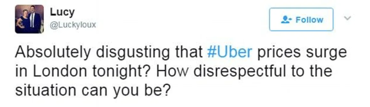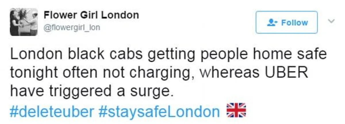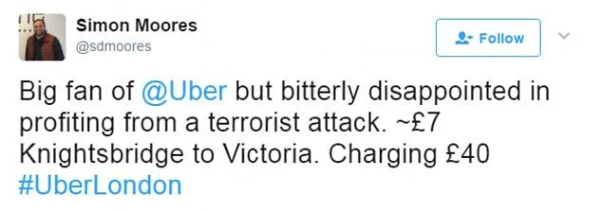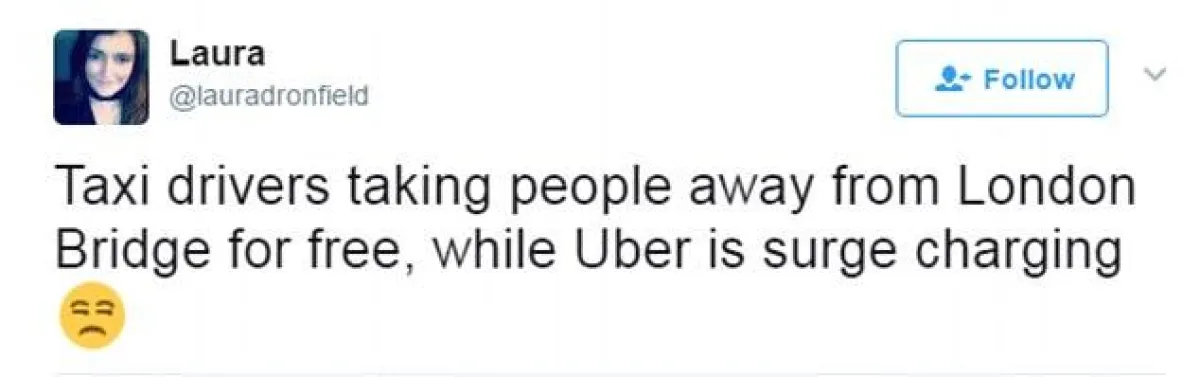 وشارك الغاضبون صوراً للمناطق التي ذهبوا إليها من مكان التفجير الذي وقع مساء السبت 3 حزيران/يونيو في لندن مع تعليقاتٍ تشير إلى أنّ الشركة استغلّت حاجة الناس للعودة إلى بيوتهم.