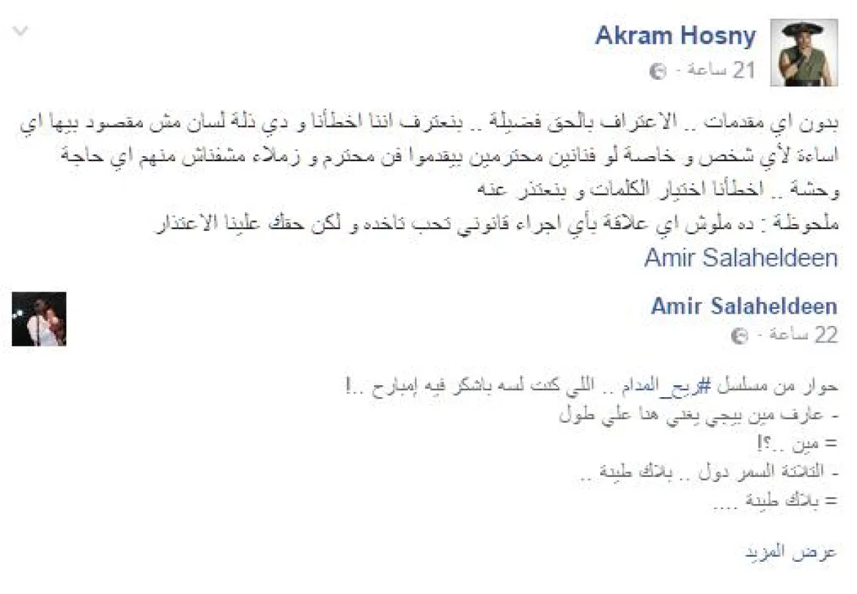 وبعدها اعتذر الفنان اكرم حسني قائلاً : دون أى مقدمات.. الاعتراف بالحق فضيلة.. بنعترف أننا اخطأنا ودي ذلة لسان مش مقصود بيها أي إساءة لأى شخص وخاصة لو فنانين محترمين بيقدموا فن محترم وزملاء مشفناش منهم أى حاجة وحشة.. أخطاءنا اختيار الكلمات وبنعتذر عنها.. ملحوظة: ده ملوش اي علاقة بأي اجراء قانوني تحب تاخده و لكن حقك علينا الاعتذار.