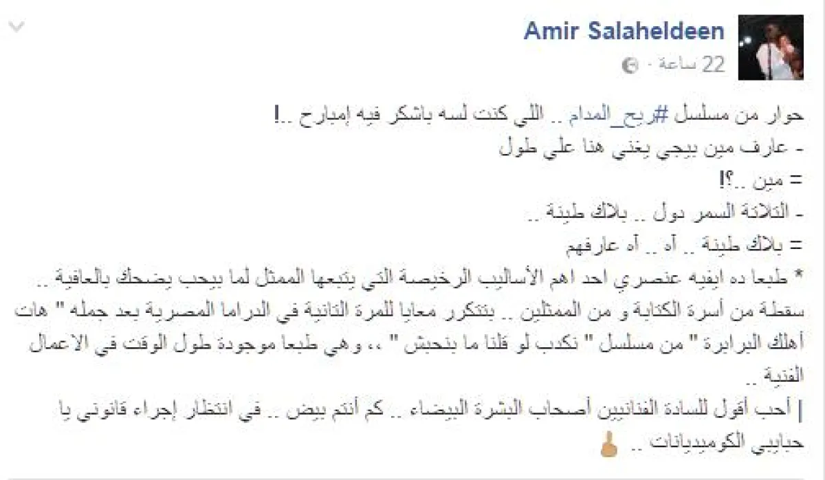 المطرب المعروف امير صلاح الدين عضو فريق "بلاك تيما" كان للمصادفة يكتب يومياً مادحاً مسلسل "ريح المدام" قبل أن تصيبه صدمة بعدما رأى السخرية العنصرية منه ومن أعضاء الفرقة، فكتب عبر صفحته على الفيس بوك "حوار من مسلسل ريح المدام.. اللى كنت لسه باشكر فيه إمبارح.. عارف مين بيجى يغنى هنا على طول مين..؟ التلاتة السمر دول.. بلاك طينة.. بلاك طينة.. آه.. آه عارفهم.. وطبعا ده إيفيه عنصرى أحد أهم الأساليب الرخيصة التى يتبعها الممثل لما بيحب يضحك بالعافية.. سقطة من أسرة الكتابة ومن الممثلين.. بتتكرر معايا للمرة التانية فى الدراما المصرية بعد جملة "هات أهلك البرابرة من مسلسل "نكدب لو قلنا ما بنحبش"، وهى طبعًا موجودة طول الوقت فى الاعمال الفنية.. أحب أقول للسادة الفنانيين أصحاب البشرة البيضاء.. كم أنتم بيض.. فى انتظار إجراء قانونى يا حبايبى الكوميديانات."