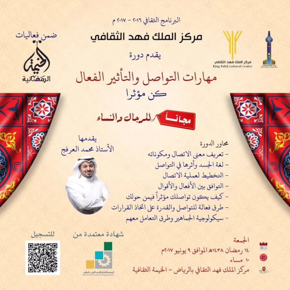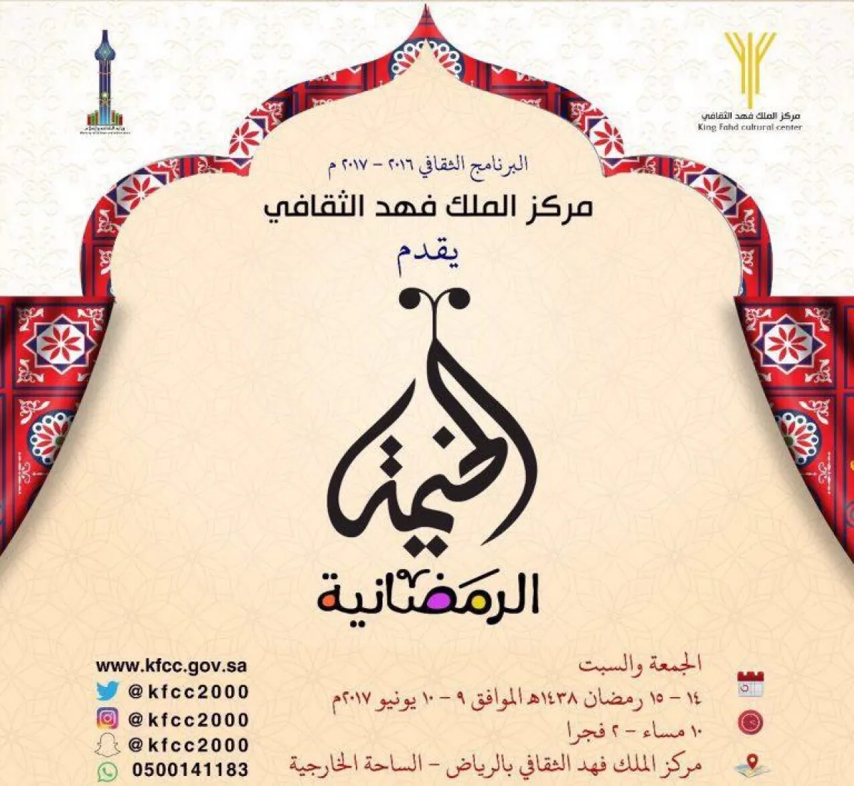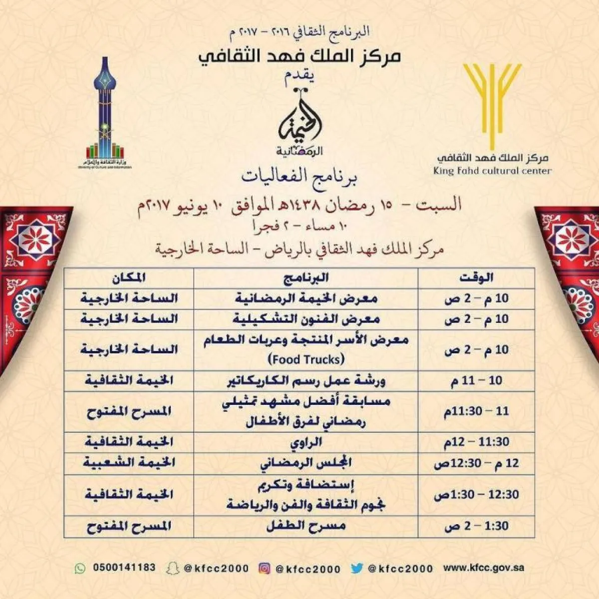 مكان إقامة الفعاليات، التي ستستمر من 14 إلى 15رمضان، مركز الملك فهد الثقافي من الساعة العاشرة مساءً وحتى الثانية صباحاً.