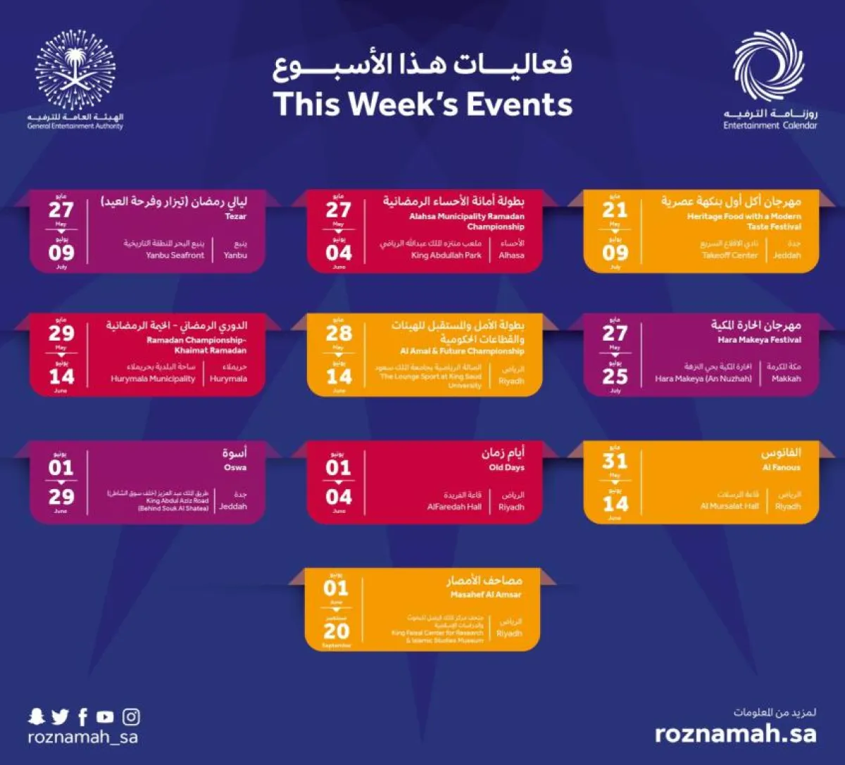 ودعت الهيئة الجميع للحضور و الاستمتاع بهذه الفعاليات، وزيارة الموقع الإلكتروني www.roznamah.sa أو حساب الروزنامة على مواقع التواصل الاجتماعي Roznamah_sa@ للحصول على معلومات أكثر عن الأنشطة الترفيهية التي ستقام في شهر رمضان الموافق لشهر يونيو.